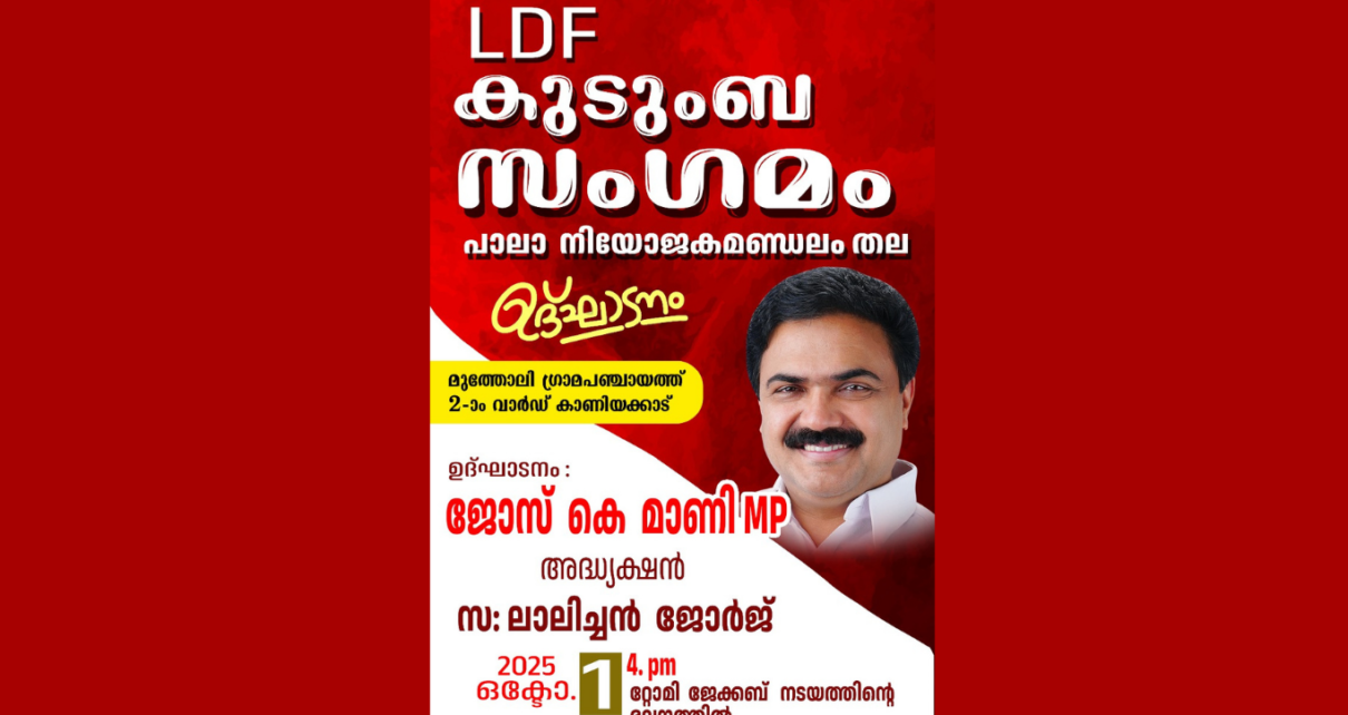 പാലാ: എൽ.ഡി.എഫ് സർക്കാരിൻ്റെ ജനപക്ഷ ഇടപെടലുകൾ വിശദീകരിക്കുന്നതിനായുള്ള വാർഡു തല കുടുoബ സംഗമങ്ങൾക്ക് പാലായിൽ ഇന്നു തുടക്കമാകും. നിയോജക മണ്ഡലം തല ആദ്യ കുടുംബ സംഗമം മുത്തോലി പഞ്ചായത്തിലെ കാണിയക്കാട് വാർഡിൽ ഇന്ന് വൈകുന്നേരം 4.30 ന് ജോസ്.കെ.മാണി എം.പി ഉദ്ഘാടനം ചെയ്യും.എൽ.ഡി.എഫ് ജില്ലാ, നിയോജക മണ്ഡലം നേതാക്കൾ യോഗത്തിൽ പ്രസംഗിക്കും.