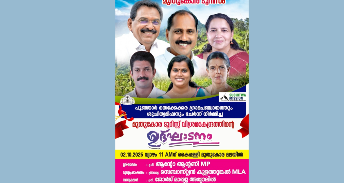 പൂഞ്ഞാർ തെക്കേക്കര ഗ്രാമപഞ്ചായത്തിൽ 5-ാംവാർഡ് കൈപ്പള്ളി, മുതുകോരമലയിൽ കേരള ശുചിത്വ മിഷനും പൂഞ്ഞാർ തെക്കേക്കര ഗ്രാമപഞ്ചായത്തും സംയുക്തമായി, ഇവിടെ വരുന്ന ടൂറിസ്റ്റുകൾക്ക് അടിസ്ഥാന സൗകര്യം ഒരുക്കുന്നതിൻ്റെ ഭാഗമായി നിർമ്മിച്ച വഴിയോര വിശ്രമ കേന്ദ്രത്തിന്റെ (Take A Break) ഉദ്ഘാടനം പൂഞ്ഞാർ തെക്കേക്കര ഗ്രാമപഞ്ചായത്ത് പ്രസിഡന്റ് ശ്രീ. ജോർജ് മാത്യുവിൻ്റെ അദ്ധ്യക്ഷതയിൽ 2-10-2025 വ്യാഴാഴ്ച 11 A.M. ന് കൂടുന്ന യോഗത്തിൽ പത്തനംതിട്ട M.P ശ്രീ. ആൻ്റോ ആൻ്റണി നിർവ്വഹിക്കും. തദവസരത്തിൽ പൂഞ്ഞാർ MLA അഡ്വ. സെബാസ്റ്റ്യൻ കുളത്തുങ്കൽ Read More…