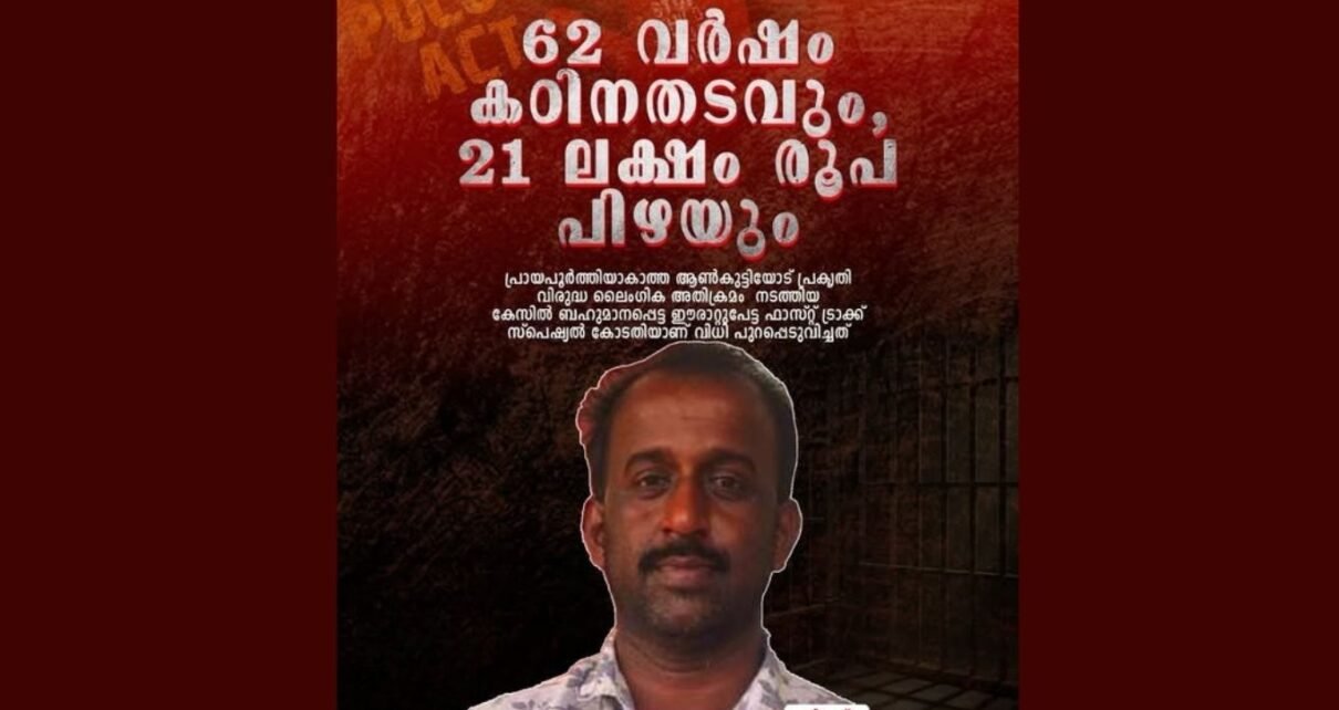 പ്രായപൂർത്തി ആകാത്ത ആൺകുട്ടിയോട് പ്രകൃതി വിരുദ്ധ ലൈംഗിക അതിക്രമം നടത്തിയ കേസിൽ പ്രതിക്ക് 62 വർഷം കഠിനതടവും, 210000/- ലക്ഷം രൂപ പിഴയും