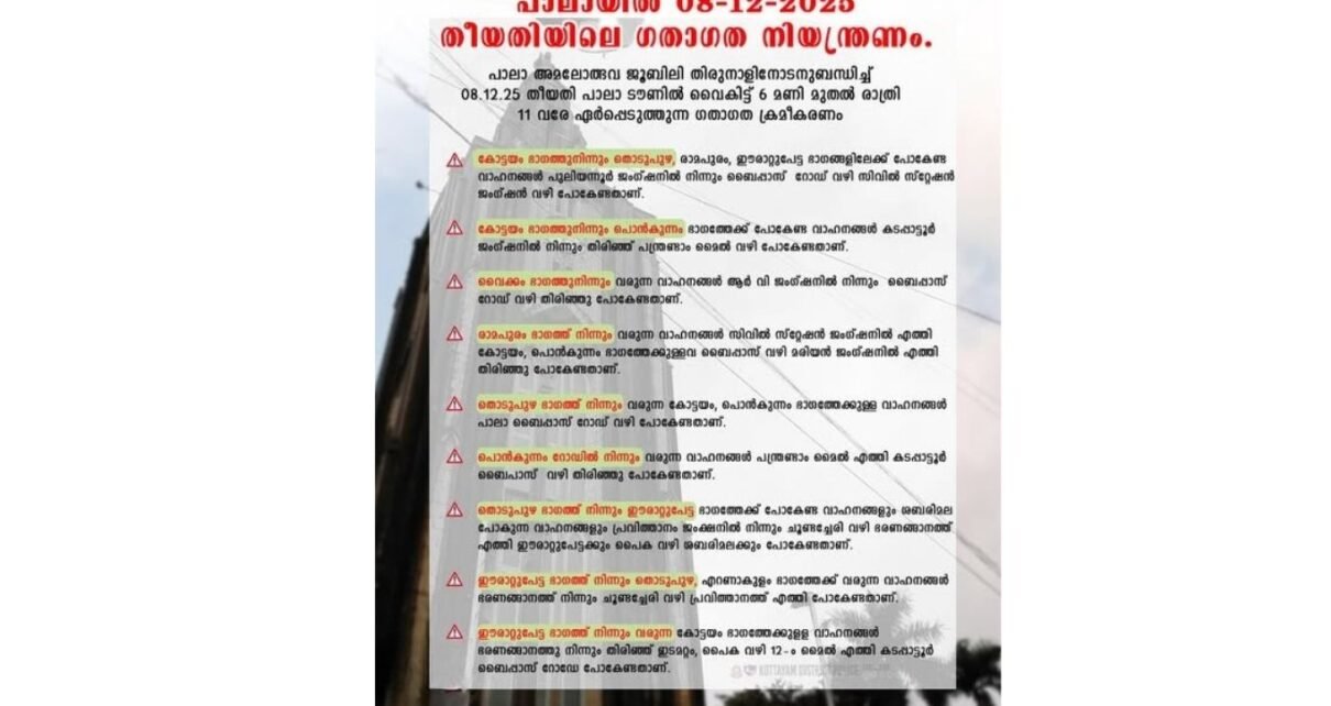 ജൂബിലി തിരുനാളിനോടനുബന്ധിച്ച് പാലായിൽ 8-ാം തീയതി ഗതാഗത നിയന്ത്രണം