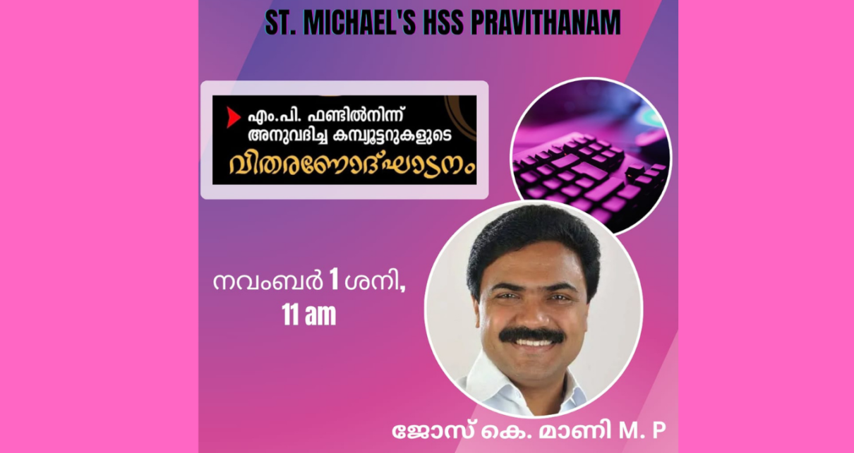 പ്രവിത്താനം : സെന്റ് മൈക്കിൾസ് ഹയർ സെക്കൻഡറി സ്കൂളിൽ എം.പി. ഫണ്ടിൽ നിന്നും ജോസ് കെ മാണി എം.പി. അനുവദിച്ച ലാപ്ടോപ്പുകളുടെ വിതരണോദ്ഘാടനം നവംബർ 1 ന് രാവിലെ 11 മണിക്ക് നടക്കും.2023-24 സാമ്പത്തിക വർഷത്തിലെ എം പി ഫണ്ടിൽ നിന്നും അനുവദിച്ച ലാപ്ടോപ്പുകൾ ആണ് വിതരണം ചെയ്യുന്നത്. സ്കൂൾ മാനേജർ റവ. ഫാ. ജോർജ് വേളുപ്പറമ്പിൽ അധ്യക്ഷത വഹിക്കുന്ന യോഗത്തിൽ ഹെഡ്മാസ്റ്റർ ജിനു ജെ. വല്ലനാട്ട്, പൂർവ വിദ്യാർത്ഥികളായ റോയ് കെ. മുളകുന്നം, സിബിച്ചൻ ജോസഫ് Read More…