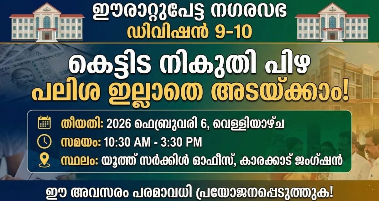 ഈരാറ്റുപേട്ട നഗരസഭയയിലെ ഡിവിഷൻ 9–10 ലെ കെട്ടിട നികുതി കുടിശ്ശിക പലിശയില്ലാതെ അടയ്ക്കുന്നതിനുള്ള പ്രത്യേക അവസരം ഇന്ന് (വെള്ളിയാഴ്ച) ഒരുക്കിയിരിക്കുന്നു. ഇന്ന് രാവിലെ 10:30 മുതൽ വൈകിട്ട് 3:30 വരെ, കാരക്കാട് ജംഗ്ഷനിലെ യൂത്ത് സർക്കിൾ ഓഫീസിൽ വെച്ചാണ് നികുതി അടയ്ക്കാനുള്ള സൗകര്യം ഒരുക്കിയിരിക്കുന്നത്. ഈ അവസരം ഉപയോഗപ്പെടുത്തി കെട്ടിട നികുതി കുടിശ്ശിക തീർപ്പാക്കാൻ ബന്ധപ്പെട്ട എല്ലാ നികുതിദായകരും പരമാവധി പേർ എത്തിച്ചേരണമെന്ന് അധികൃതർ അറിയിച്ചു.