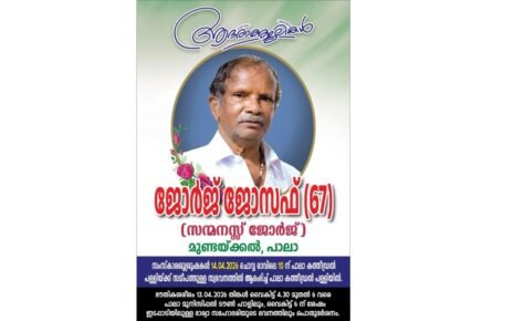 പാലാ: സാമൂഹിക പ്രവർത്തകൻ പാലാ തെക്കേക്കര മുണ്ടയ്ക്കൽ സന്മനസ്സ് ജോർജ് (ജോർജ് ജോസഫ്-67) അന്തരിച്ചു. ഭൗതീകശരീരം തിങ്കളാഴ്ച (13/04/2026) വൈകിട്ട് 4.30 മുതൽ 6 വരെ പല മുൻസിപ്പൽ ടൗൺ ഹാളിലും വൈകിട്ട് 6 നു ശേഷം ഇടപ്പാടിയിലുള്ള ഭാര്യാ സഹോദരിയുടെ വീട്ടിലും പൊതുദർശനത്തിന് വയ്ക്കുന്നതാണ്. സംസ്കാര ശുശ്രുഷകൾ ചൊവ്വാഴ്ച (14/04/2026) രാവിലെ 10 മണിക്ക് പാലാ കത്തീഡ്രൽ പള്ളിക്ക് സമീപത്തുള്ള വീട്ടിൽ ആരംഭിച്ച് പാലാ കത്തീഡ്രൽ പള്ളി സെമിത്തേരിയിൽ സംസ്കരിക്കുന്നതുമാണ്. ഭാര്യ: പാലാ തൈമുറിയിൽ ലിസി. Read More…