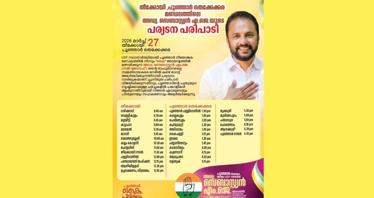 തീക്കോയി: പൂഞ്ഞാർ നിയോജക മണ്ഡലം ഐക്യ ജനാധിപത്യ മുന്നണി സ്ഥാനാർത്ഥി അഡ്വ. സെബാസ്റ്റ്യൻ എം. ജെ മൂലേച്ചാലിൽ നാളെ തീക്കോയി, പൂഞ്ഞാർ തെക്കേക്കര പഞ്ചായത്തുകളിൽ പര്യടനം നടത്തും.