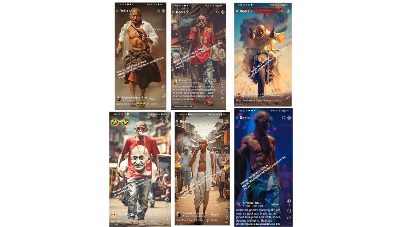 അഹിംസയുടെ പ്രവാചകനായ ഗാന്ധിജി തോക്കുകളുമായി അക്രമത്തിനു പുറപ്പെടുന്ന വിധത്തിൽ വിവിധതരം വീഡിയോകളാണ് എഐ മുഖേന നിർമ്മിച്ച് വ്യാപകമായി പ്രചരിപ്പിക്കുന്നത്.