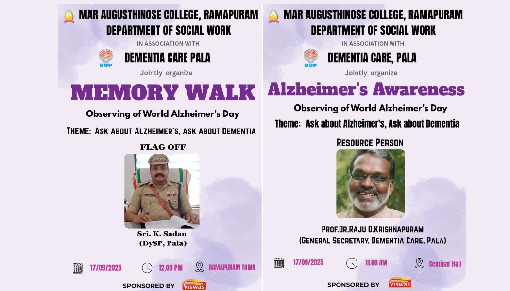 17 .09 2025 ബുധൻ 11 ന് നടക്കുന്ന ഡിമെൻഷ്യ അവബോധന പരിപാടിയിൽ പ്രിൻസിപ്പൽ ഡോ. റെജി വർഗീസ് മേക്കാടൻ അധ്യക്ഷത വഹിക്കും.അൽഷിമേഴ്സ് ദിനാചരണത്തോടനുബന്ധിച്ച് വിദ്യാർത്ഥികളുടെ നേതൃത്വത്തിൽ നടത്തുന്ന മെമ്മറി വോക്ക് പാലാ ഡി വൈ എസ് പി ശ്രീ കെ. സദൻ ഫ്ലാഗ് ഓഫ് ചെയ്യും.
