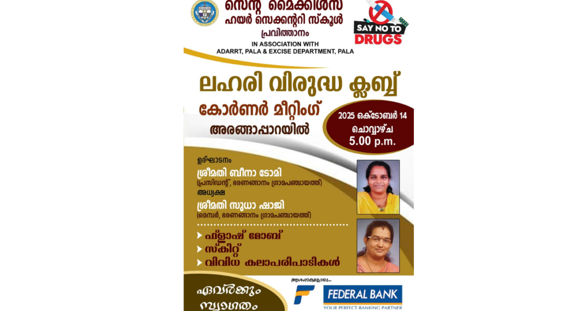 ഭരണങ്ങാനം ഗ്രാമപഞ്ചായത്ത് മെമ്പർ സുധാ ഷാജിയുടെ അധ്യക്ഷതയിൽ ചേരുന്ന യോഗം ഭരണങ്ങാനം ഗ്രാമപഞ്ചായത്ത് പ്രസിഡന്റ് ബീന ടോമി ഉദ്ഘാടനം ചെയ്യും. ഹെഡ്മാസ്റ്റർ ജിനു. ജെ. വല്ലനാട്ട്, ലഹരിവിരുദ്ധ ക്ലബ്ബ് കോർഡിനേറ്റർമാരായ ലീന സെബാസ്റ്റ്യൻ, എലിസബത്ത് മാത്യു, ജോജിമോൻ ജോസ് എന്നിവർ നേതൃത്വം നൽകും.