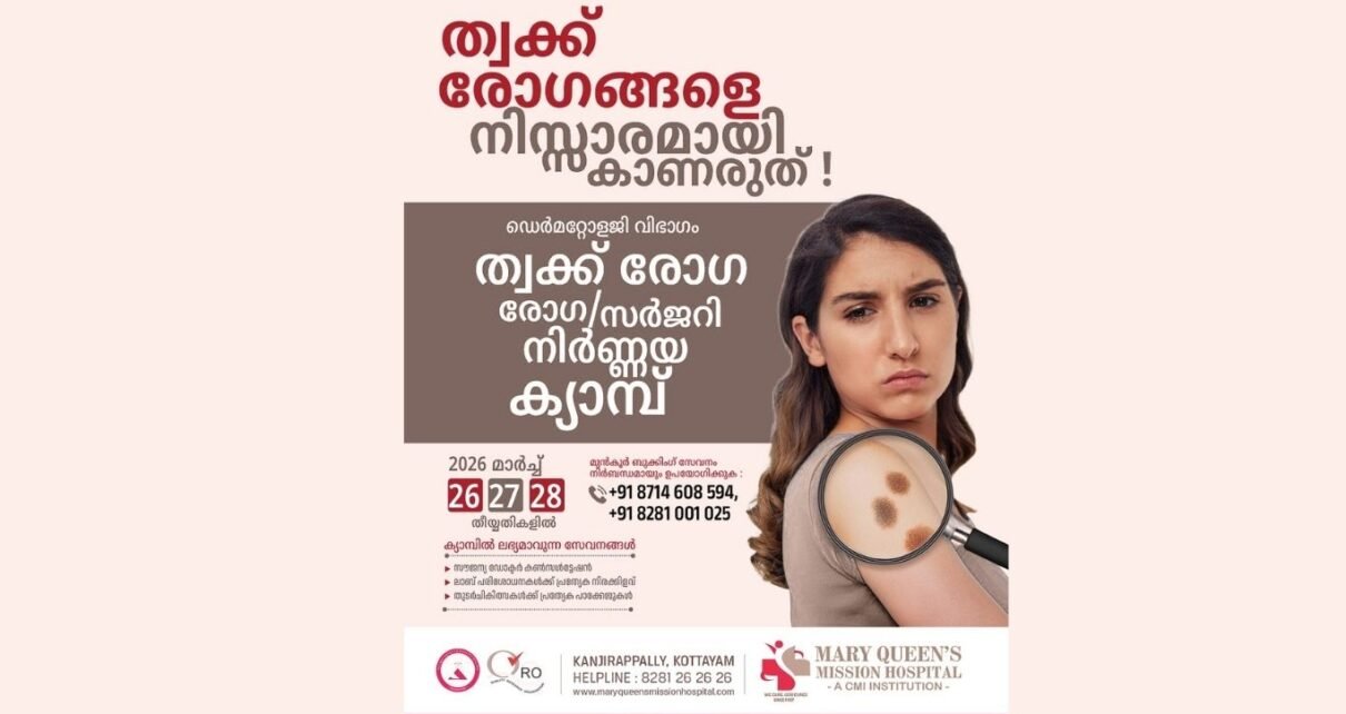 കാഞ്ഞിരപ്പളളി: മേരീക്വീൻസ് ആശുപത്രിയിലെ ത്വക്ക് രോഗ ചികിത്സാ വിഭാഗത്തിന്റെ ആഭിമുഖ്യത്തിൽ 2026 മാർച്ച് 26 മുതൽ 28 വരെ നടക്കുന്ന സൗജന്യ ത്വക്ക് രോഗ നിർണ്ണയ ക്യാമ്പിൽ പങ്കെടുക്കുന്നവർക്ക് സൗജന്യ ഡോക്ടർ കൺസൾട്ടേഷൻ, വിവിധ രക്തപരിശോധനകൾ, ചികിത്സകൾ എന്നിവയ്ക്ക് പ്രത്യേക നിരക്കിളവുകൾ എന്നിവ ലഭ്യമാകും. ക്യാമ്പിന് ഡെർമറ്റോളജി വിഭാഗത്തിലെ ഡോ. ഗിരീഷ് നേതൃത്വം വഹിക്കും. ക്യാമ്പിൽ പങ്കെടുക്കുന്നവർ മുൻകൂർ ബുക്കിംഗ് സേവനം നിർബന്ധമായും ഉപയോഗിക്കണമെന്ന് ആശുപത്രി അധികൃതർ അറിയിച്ചു. കൂടുതൽ വിവരങ്ങൾക്ക് +91 87146 08594, 82810 Read More…