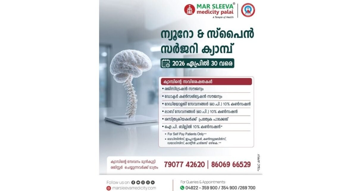 മാർ സ്ലീവാ മെഡിസിറ്റിയിൽ ന്യൂറോ ആൻഡ് സ്പൈൻ സർജറി ക്യാമ്പ് ഏപ്രിൽ 30 വരെ