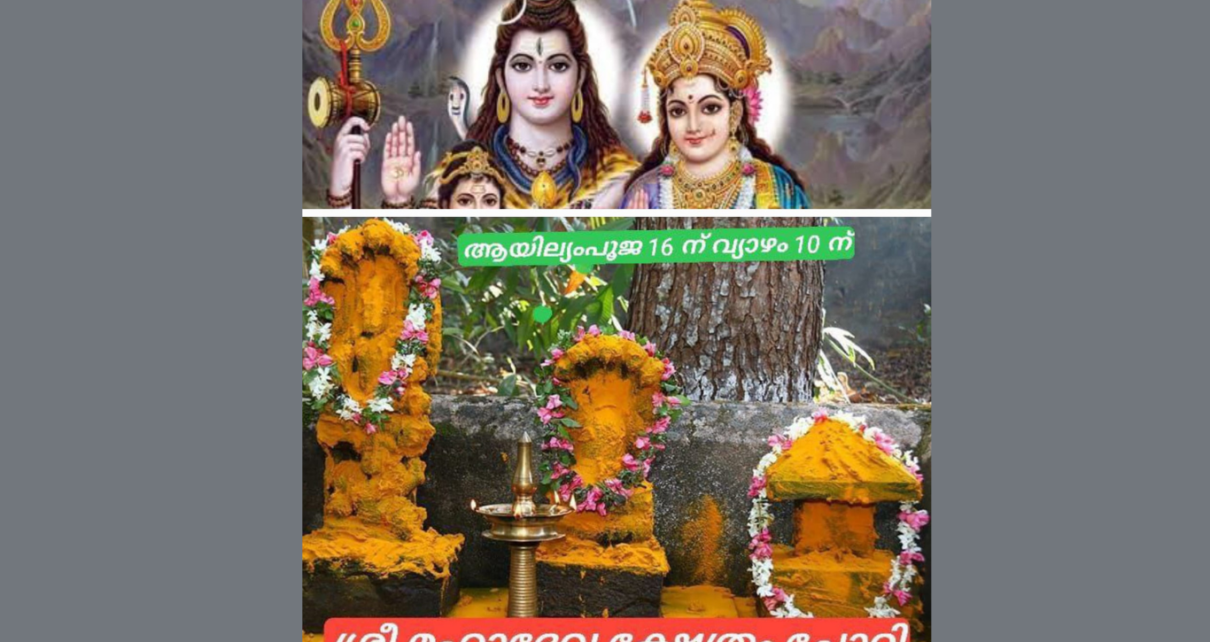 പാറത്തോട്: പ്രത്യക്ഷ ദൈവങ്ങളായ നാഗദേവതകളെ ആരാധിച്ചും പ്രീതിപ്പെടുത്തിയും , നാഗലോകത്തെ ഉണർത്തിച്ചും, കന്നി മാസത്തിലെ ആയില്യം നാളായ 16 ന് വ്യാഴാഴ്ച ചോറ്റി ശ്രീ മഹാദേവക്ഷേത്രത്തിൽ ആയില്യം പൂജ നടത്തുന്നതാണ്.