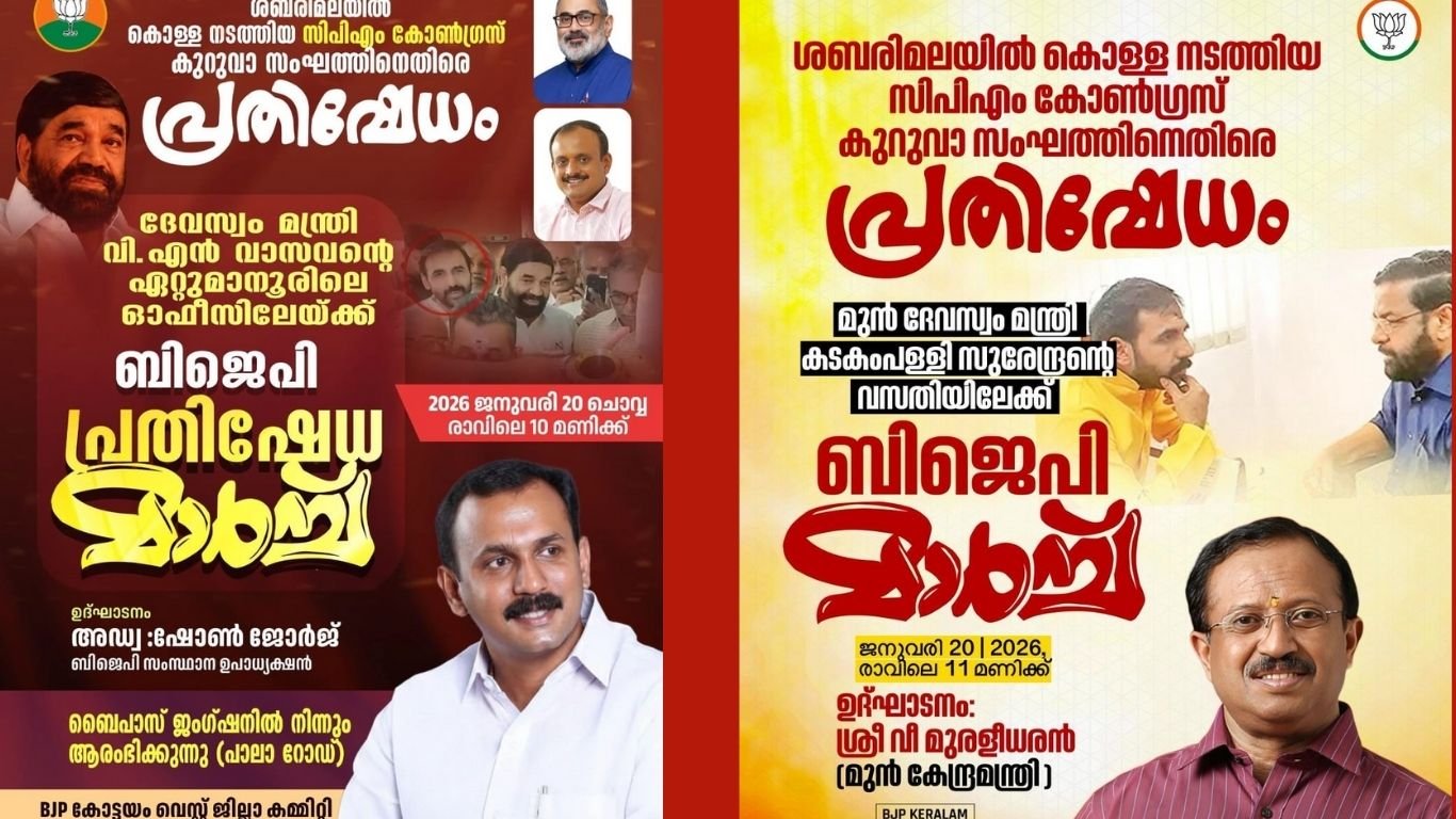 സ്വാമി അയ്യപ്പൻ്റെ സ്വർണ്ണം കൊള്ളയടിച്ച സിപിഎം-കോൺഗ്രസ് ഒത്തുകളിയിൽ പ്രതിഷേധിച്ച് മുൻ ദേവസ്വം മന്ത്രി കടകംപള്ളി സുരേന്ദ്രന്റെ വസതിയിലേക്ക് ബിജെപി നടത്തുന്ന പ്രതിഷേധ മാർച്ച് 2026 ജനുവരി 20 രാവിലെ 11ന് മുൻ കേന്ദ്രമന്ത്രി ശ്രീ വി മുരളീധരൻ ഉദ്ഘാടനം ചെയ്യും.