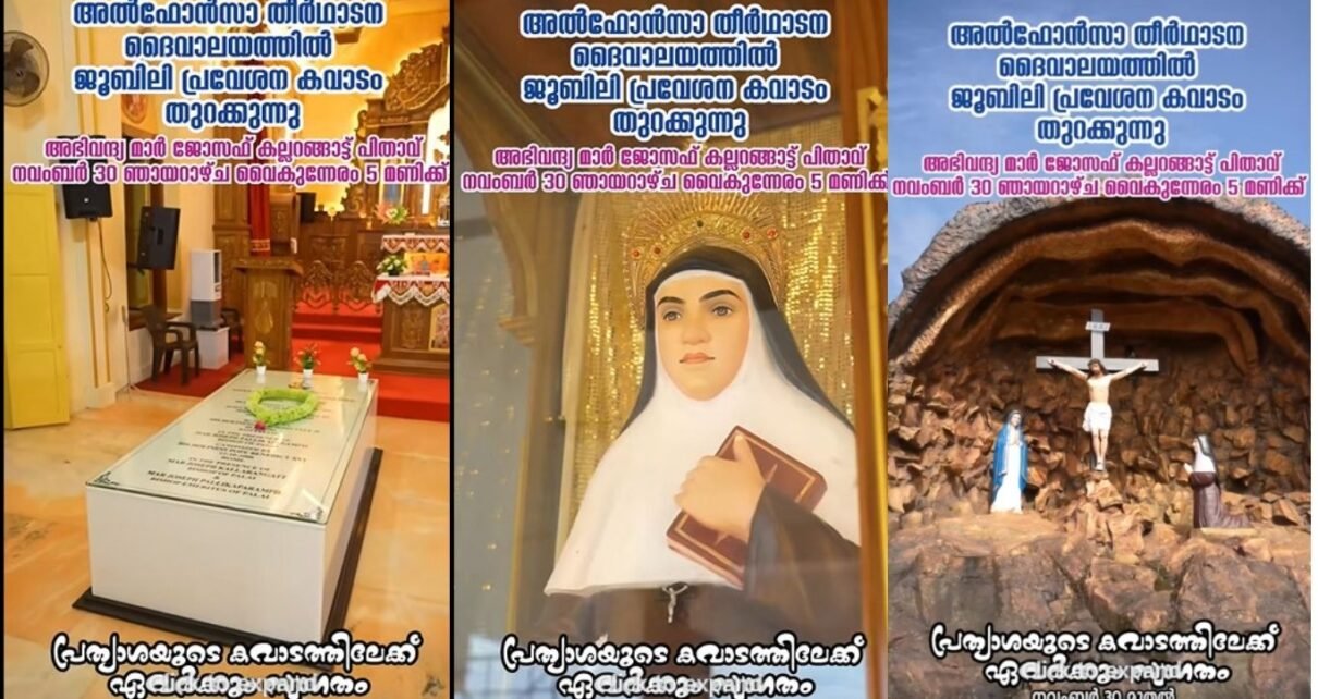 ഭരണങ്ങാനം: ഈശോയുടെ പിറവിയുടെ 2025-ാം വര്ഷ ജൂബിലിയുടെ ഭാഗമായ ജൂബിലി കവാടം – പ്രത്യാശയുടെ വാതില് നാളെ വൈകുന്നേരം അഞ്ചിന് അല്ഫോന്സാ ഷ്റൈനില് ബിഷപ് മാര് ജോസഫ് കല്ലറങ്ങാട്ട് തുറക്കും. പ്രാര്ഥനാശുശ്രൂഷയില് മാര് ജോസഫ് പള്ളിക്കാപറമ്പില്, മുഖ്യ വികാരി ജനറാള് മോണ്. ജോസഫ് തടത്തില്, ഫൊറോന വികാരി ഫാ. സക്കറിയാസ് ആട്ടപ്പാട്ട്, വൈദികര്, സമര്പ്പിതര്, അല്മായ പ്രമുഖര് തുടങ്ങിയവര് പങ്കെടുക്കും. ജൂബിലി പ്രമാണിച്ച് ഡിസംബര് ഒന്നുമുതല് 2026 ജനുവരി ആറുവരെ എല്ലാ ദിവസവും അല്ഫോന്സാ ഷ്റൈന് 24 Read More…