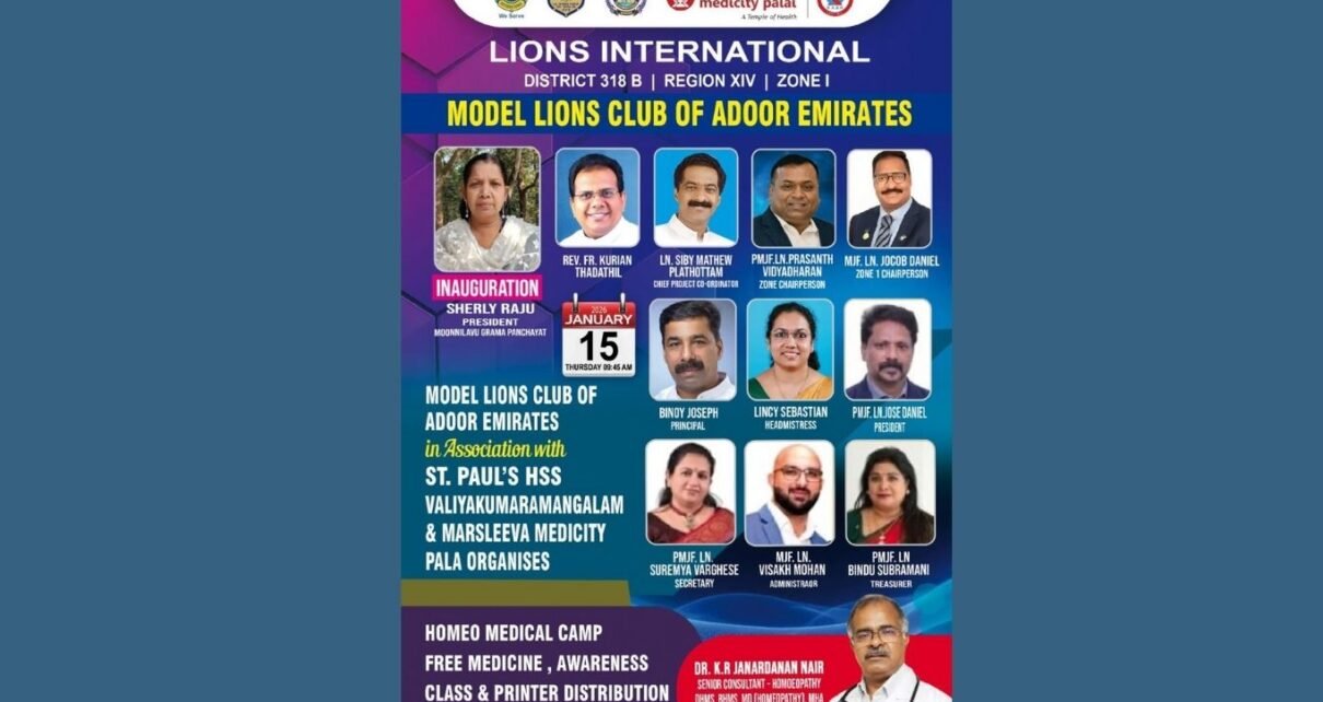 മൂന്നിലവ്: മോഡൽ ലയൺസ് ക്ലബ്ബ് ഓഫ് അടൂർ എമിറേറ്റ്സിൻറ നേതൃത്വത്തിൽ മൂന്നിലവ് സെൻറ് പോൾസ് HSS ൽ സൗജന്യ ഹോമിയോ മെഡിക്കൽ ക്യാമ്പും ബോധവൽക്കരണ ക്ളാസും പ്രിൻറർ വിതരണവും നടത്തപ്പെടും. പരിപാടിയുടെ ഉദ്ഘാടനം മൂന്നിലവ് ഗ്രാമപഞ്ചായത്ത് പ്രസിഡന്റ് ഷേർലി രാജു നിർവ്വഹിക്കും. ലയൺസ് ജില്ലാ ചീഫ് പ്രോജക്റ്റ് കോർഡിനേറ്റർ സിബി മാത്യു പ്ലാത്തോട്ടം മുഖ്യപ്രഭാഷണം നടത്തും.സ്കൂൾ പ്രിൻസിപ്പൽ ബിനോയി ജോസഫ് ഹെഡ്മിസ്ട്രസ്സ് ലൂസി സെബാസ്റ്യൻ, മനേഷ് കല്ലറയ്ക്കൽ തുടങ്ങിയവർ ആശംസകൾ അർപ്പിച്ചു സംസാരിക്കും. പാലാ മാർസ്ലീവാ മെഡിസിറ്റിയുടെ Read More…
