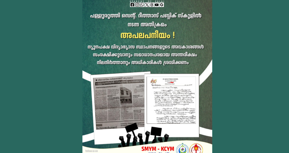 പാലാ : കൊച്ചി പള്ളുരുത്തി സെൻ്റ്. റീത്താസ് പബ്ലിക് സ്കൂളിൽ നടന്ന അതിക്രമം അപലപനീയമെന്ന് പാലാ രൂപത എസ്എംവൈഎം. മതപരമായ ചിഹ്നം യൂണിഫോമിൻ്റെ ഭാഗമാക്കണമെന്നാവശ്യപ്പെട്ട്, സ്കൂളിൻ്റെ നിയമങ്ങൾ ലംഘിച്ച് ഒരുകൂട്ടം വർഗീയവാദികൾ സ്കൂളിലേക്ക് അതിക്രമിച്ചു കയറി ഭീകരാന്തരീക്ഷം സൃഷ്ടിക്കാൻ ശ്രമിച്ചത് തികച്ചും പ്രതിഷേധാർഹമാണ്. വിദ്യാഭ്യാസം, അച്ചടക്കം, മതേതരമായ അന്തരീക്ഷം എന്നിവയെ തകർക്കാൻ ലക്ഷ്യമിട്ടുള്ള ഈ നീക്കം യാതൊരു കാരണവശാലും അനുവദിക്കാനാവില്ല. ന്യൂനപക്ഷ വിദ്യാഭ്യാസ സ്ഥാപനങ്ങളുടെ അവകാശങ്ങൾ സംരക്ഷിക്കാനും സമാധാനപരമായ അന്തരീക്ഷം നിലനിർത്താനും അധികാരികൾ ശ്രദ്ധിക്കണമെന്നും എസ്എംവൈഎം പാലാ Read More…