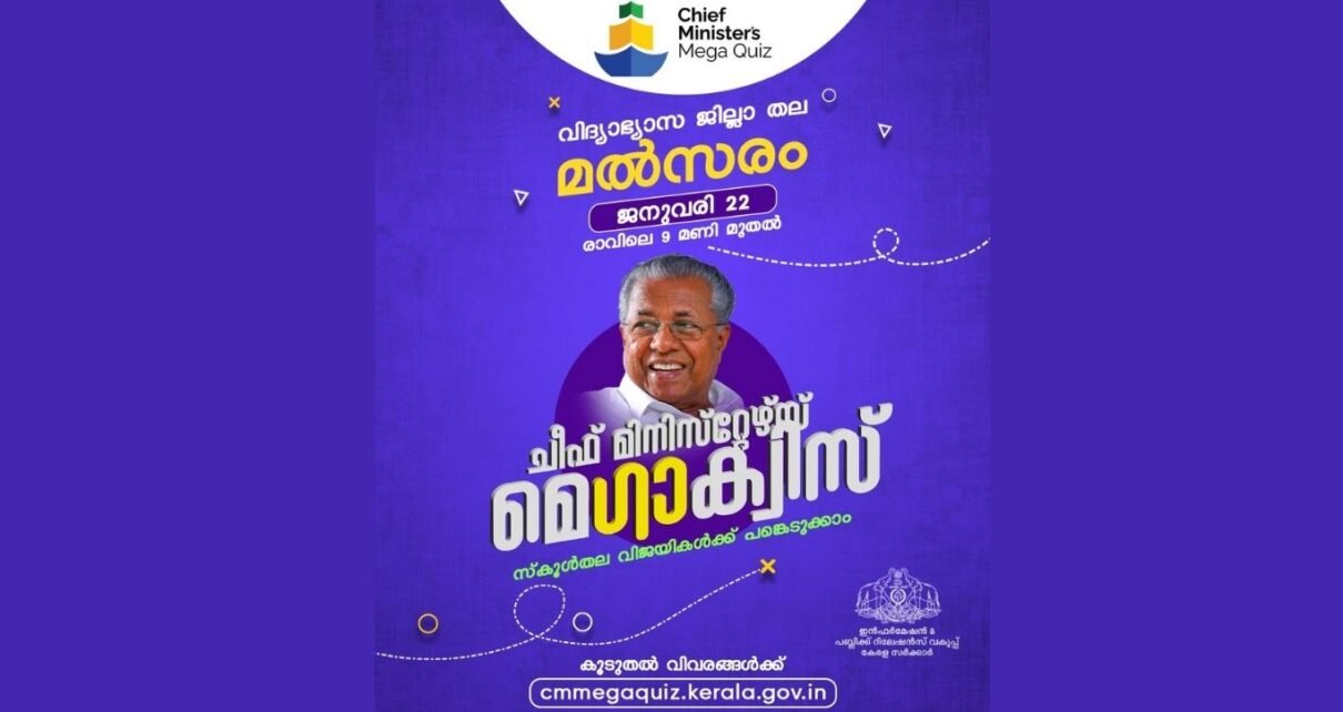 കേരളത്തിന്റെ സാമൂഹിക പുരോഗമന ചരിത്രം അടിസ്ഥാനമാക്കി സംസ്ഥാന സർക്കാർ സംഘടിപ്പിക്കുന്ന ചീഫ് മിനിസ്റ്റേഴ്സ് മെഗാ ക്വിസ് മത്സരത്തിലെ സ്കൂൾതല വിദ്യാഭ്യാസ ജില്ലാ മത്സരം ജനുവരി 22 ന് നടക്കും.