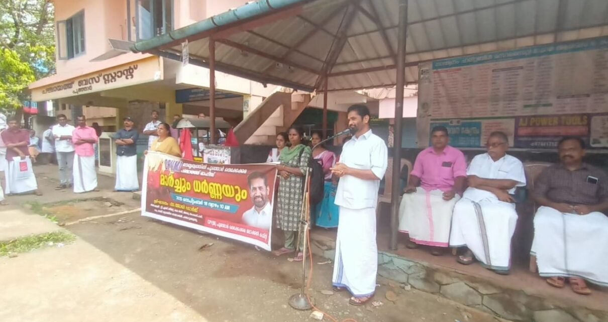 പൂഞ്ഞാർ: സി.പി.ഐ.എം പൂഞ്ഞാർ തെക്കേക്കര ലോക്കൽ കമ്മിറ്റിയുടെ നേതൃത്വത്തിൽ പഞ്ചായത്ത് ഭരണസമിതിയുടെ അഴിമതിയ്ക്കും ധൂർത്തിനും കെടുകാര്യസ്ഥതയ്ക്കെതിരെയും ഗാന്ധി പ്രതിമസ്ഥാപിച്ച് സ്വാതന്ത്ര്യ സമരസേനാനികളുടെ പേര് സ്തൂപത്തിൽ ആലേഖനം ചെയ്യുമെന്ന് പറഞ്ഞ് ലക്ഷങ്ങൾ നഷ്ടപ്പെടുത്തുകയും കേരളത്തിലെ എൽ.ഡി.എഫ് സർക്കാർ വിഭാവനം ചെയ്ത മാലിന്യ നിർമ്മാർജ്ജന പദ്ധതി പൂഞ്ഞാർ തെക്കേക്കര പഞ്ചായത്തിൽ ഫലപ്രദമായി നടപ്പിലാക്കാത്ത പഞ്ചായത്ത് ഭരണസമിതി മറുപടി പറയണമെന്നും ആവശ്യപ്പെട്ട് നടന്ന പ്രതിഷേധ ധർണ്ണ സി.പി.ഐ.എം ജില്ലാ കമ്മിറ്റിയംഗം ജോയി ജോർജ് ഉദ്ഘാടനം ചെയ്തു.