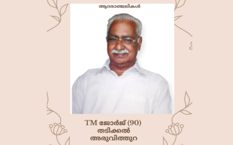 അരുവിത്തുറ: തടിക്കൽ ടി.എം. ജോർജ് (അപ്പച്ചൻ -90) നിര്യാതനായി. ഭൗതികശരീരം നാളെ, ഞായറാഴ്ച (26-10-2025) രാവിലെ 9 മണിക്ക് സ്വവസതിയിൽ കൊണ്ടുവരുന്നതും മൃതസംസ്കാര ശുശ്രൂഷകൾ ഉച്ചകഴിഞ്ഞ് 2 മണിക്ക് ഭവനത്തിൽ ആരംഭിച്ച് അരുവിത്തുറ സെന്റ് ജോർജ് ഫൊറോനാ പള്ളിയിൽ സംസ്കരിക്കുന്നതാണ്. ഭാര്യ: തീക്കോയി ഒഴാക്കൽ പരേതയായ ലീലാമ്മ. മക്കൾ: കുട്ടിയമ്മ, എൽസമ്മ, ആനിയമ്മ, സജി, സിജി, സുഭാഷ്, സുനീഷ് (തടിക്കൽ ഫുഡ് പ്രോസസിങ് കമ്പനി ഈരാറ്റുപേട്ട), സിൻസി. മരുമക്കൾ: ചാക്കോച്ചൻ കൊട്ടാരത്തിൽ അന്തിനാട്, ജയിംസ് വെള്ളാപ്പിള്ളിൽ കലയന്താനി, റെജി Read More…