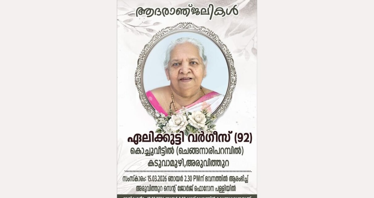 ഭരണങ്ങാനം : ചുമപ്പുങ്കൽ അന്നക്കുട്ടി ജോസഫ് (87) നിര്യാതയായി. ചുമപ്പുങ്കൽ അന്നക്കുട്ടി ജോസഫ് (87) അന്തരിച്ചു. സംസ്കാരം ഇന്ന് 3ന് വസതിയിൽ ശുശ്രൂഷയ്ക്ക് ശേഷം സെന്റ് മേരീസ് ഫൊറോനാ പള്ളിയിൽ. കിഴപറയാർ പെരുവാച്ചിറ കുടുംബാംഗമാണ്. ഭർത്താവ്: പരേതനായ സി.വി.ജോസഫ്. മക്കൾ: ജോഷി, റോസ്മോൾ, മറിയമ്മ, ജോമോൻ (ചുമപ്പുങ്കൽ റബേഴ്സ് ഇടമറ്റം), ഹെലൻ സോണിയ, അലക്സ് (വിശ്വാസ് ആയുർവേദിക് മെഡിക്കൽസ് തൊടുപുഴ, ജീവനം പാലാ). മരുമക്കൾ: റോസമ്മ പേരേക്കാട്ട് പനമുക്കിൽ (ഭരണങ്ങാനം), ജോയി പുറപ്പന്താനം (തീക്കോയി), ബൈജു പ്രക്കാട്ട് Read More…