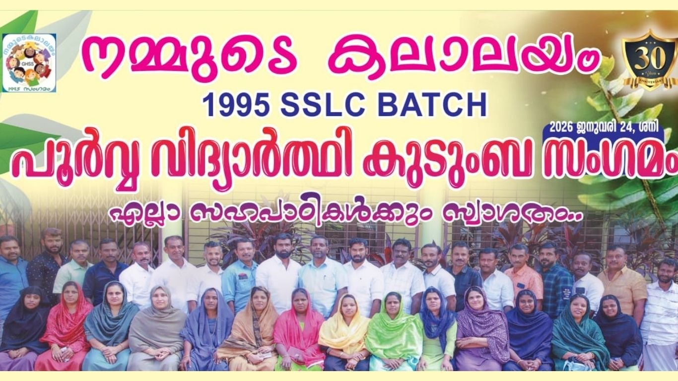 ഈരാറ്റുപേട്ട : ഈരാറ്റുപേട്ട തെക്കേക്കര ഗവ:ഹയർ സെക്കണ്ടറി സ്കൂളിലെ 1995 എസ്.എസ്.എൽ.സി. ബാച്ചിലെ വിദ്യാത്ഥികൾ. “ഭൂതകാലങ്ങളിൽ 2026 ” വിദ്യാത്ഥി കുടുംബസംഗമം (ശനിയാഴ്ച) 24/1/2026 രാവിലെ പത്ത് മണി മുതൽ സ്കൂൾ ഓഡിറ്റേറിയത്തിൽ വെച്ച് നടത്തപ്പെടും. കൂടുതൽ വിവരങ്ങൾക്ക് :974728286, 9847 842247