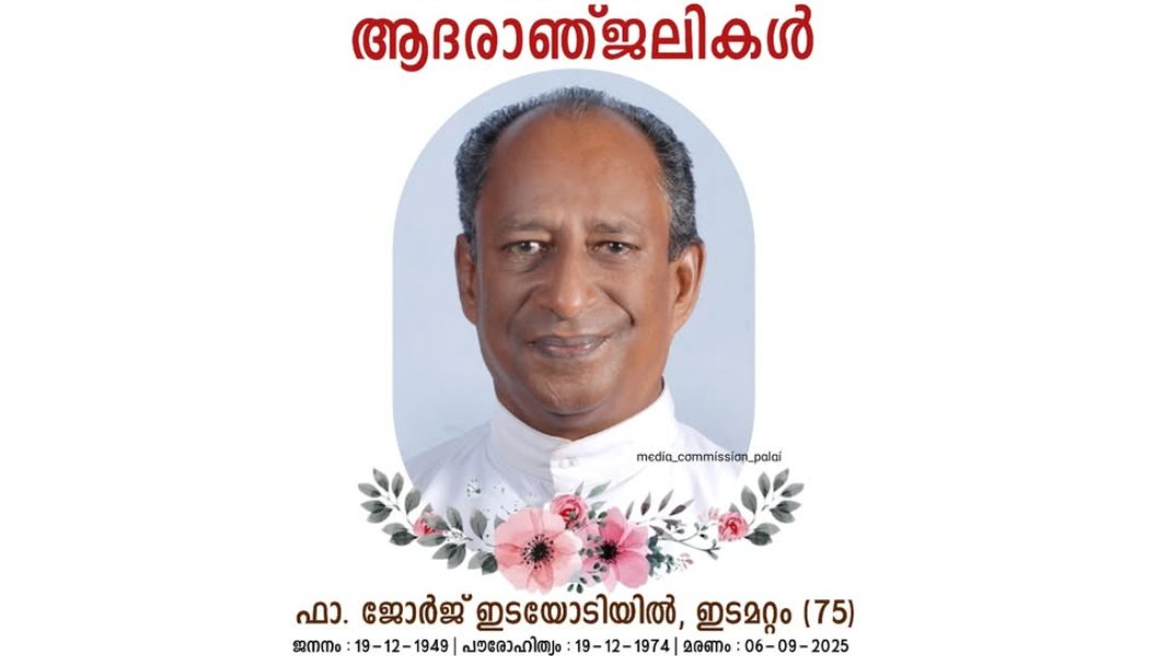 ഇടമറ്റം :റവ. ഫാ. ജോർജ് ഇടയോടിയിൽ (75) നിര്യാതനായി. സംസ്കാര ശുശ്രൂഷ നാളെ (ഞായർ, 07.09.2025) ഉച്ചകഴിഞ്ഞ് 03.00 മണിക്ക് ഇടമറ്റത്തുള്ള അദ്ദേഹത്തിന്റെ വീട്ടിൽ ആരംഭിക്കും. തുടർന്ന് വിശുദ്ധ കുർബാനയും 04.00 മണിക്ക് ഇടമറ്റം സെന്റ് മൈക്കിൾസ് പള്ളിയിൽ അന്ത്യകർമങ്ങളും നടക്കും.