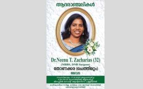 പാലാ: മീനച്ചിൽ സ്വദേശിനിയായ യുവ ഡോക്ടർ കുഴഞ്ഞുവീണ് മരിച്ച നിലയിൽ. മീനച്ചിൽ മൂലെത്തുണ്ടി ഭാഗത്ത് താമസിക്കുന്ന തോണക്കര സക്കറിയ ജോസഫിന്റെ മകൾ നീനു (29) ആണ് മരിച്ച നിലയിൽ കാണപ്പെട്ടത്. വീട്ടുകാർ അടുത്തുള്ള സ്വകാര്യ ആശുപത്രിയിൽ എത്തിച്ചെങ്കിലും മരണം സ്ഥിരീകരിക്കുകയായിരുന്നു. നാളെ രാവിലെ 10 മണിക്ക് കോട്ടയം മെഡിക്കൽ കോളേജിൽ പോസ്റ്റുമോർട്ടം നടക്കും. സംസ്കാരം ബുധനാഴ്ച (17/ 12/ 2025) 4 മണിക്ക് ഭവനത്തിൽ ആരംഭിച്ച് മീനച്ചിൽ സെൻറ് ആൻറണീസ് പള്ളിയിൽ. പഠനത്തെ തുടർന്ന് സ്വകാര്യ ആശുപത്രിയിൽ Read More…
