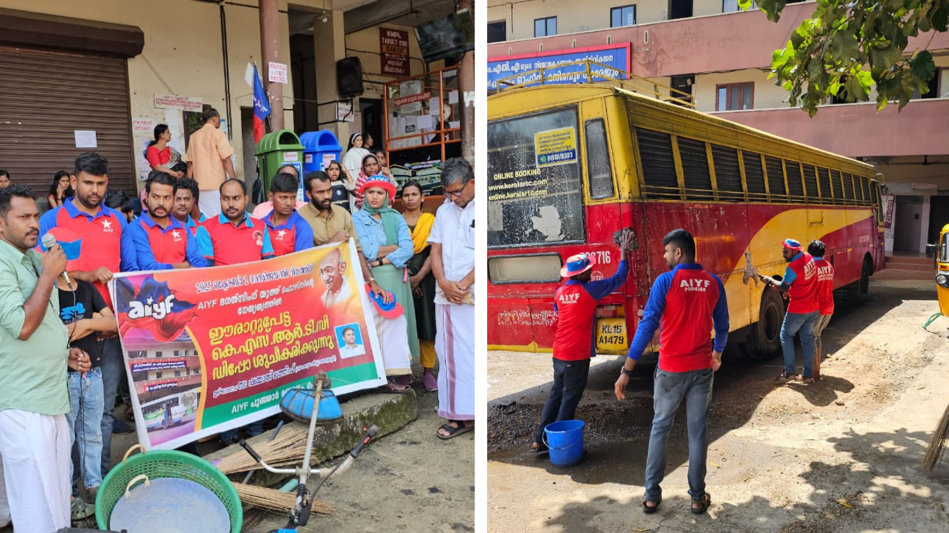 ഒക്ടോബർ 2 ഗാന്ധിജയന്തി ദിനത്തോടനുബന്ധിച്ച് AIYF സംസ്ഥാന കമ്മിറ്റി ആഹ്വാനം ചെയ്ത പൊതു ഇടങ്ങൾ ശുചീകരിക്കുക എന്ന ക്യാമ്പയിന്റെ ഭാഗമായി പൂഞ്ഞാർ മണ്ഡലം ഭഗത് സിംഗ് യൂത്ത് ഫോഴ്സിന്റെ നേതൃത്വത്തിൽ സംഘടിപ്പിച്ച ഈരാറ്റുപേട്ട കെഎസ്ആർടിസി ഡിപ്പോ ശുചീകരിക്കുന്ന പരിപാടി AIYF ജില്ലാ സെക്രട്ടറി ഷമ്മാസ് ലത്തീഫ് ഉദ്ഘാടനം ചെയ്തു.