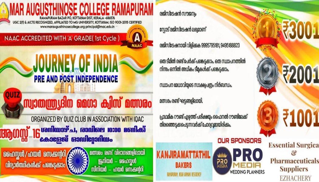 പാലാ: സ്വാതന്ത്ര്യദിനാഘോഷങ്ങളുടെ ഭാഗമായി രാമപുരം മാർ അഗസ്തിനോസ് കോളജ് ക്വിസ് ക്ലബിന്റെ നേതൃത്വത്തിൽ IQACയുടെ സഹകരണത്തോടെ “ജേർണി ഓഫ് ഇന്ത്യ: സ്വാതന്ത്ര്യത്തിന് മുമ്പും ശേഷവും” എന്ന വിഷയത്തിൽ മെഗാ ക്വിസ് മത്സരം സംഘടിപ്പിക്കുന്നു. ആഗസ്റ്റ് 16-ാം തീയതി ശനി രാവിലെ 10 മണിക്ക് കോളജ് ഓഡിറ്റോറിയത്തിൽ മത്സരം നടക്കും.