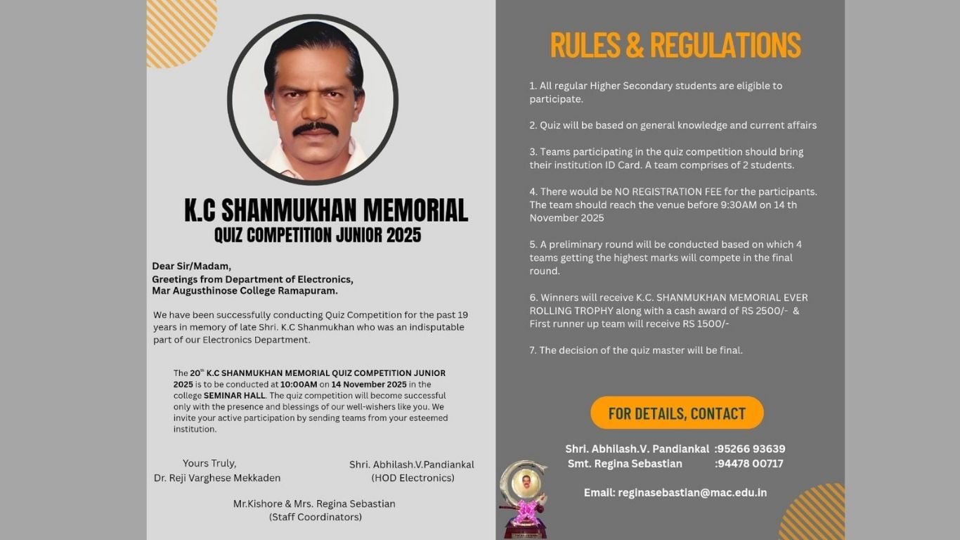 രാമപുരം മാർ ആഗസ്തീനോസ് കോളേജ് ഇലക്ട്രോണിക്സ് ഡിപ്പാർട്ട്മെന്റിന്റെ ആഭിമുഖ്യത്തിൽ ഹയർ സെക്കണ്ടറി വിദ്യാർഥികൾക്കായി നടത്തുന്ന 20 ആ മത് കെ സി ഷണ്മുഖൻ മെമ്മോറിയൽ ജൂനിയർ ക്വിസ് മത്സരം നവംബർ 14 രാവിലെ 10 :00 ന് കോളേജിലെ സെമിനാർ ഹാളിൽ നടക്കും.