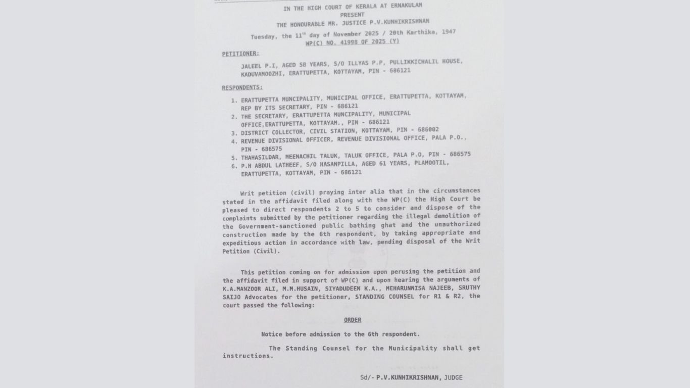 ആറാം എതിർകക്ഷിയായ പി.എച്ച്.അബ്ദുൽ ലത്തീഫിന് നോട്ടീസ് അയക്കാൻ ജസ്റ്റീസ് പി.വി. കുഞ്ഞികൃഷ്ണൻ ഉത്തരവിട്ടു. ഹർജിക്കാരന് വേണ്ടി അഡ്വ.കെ.എ. മൻസൂർ അലി ഹാജരായി.