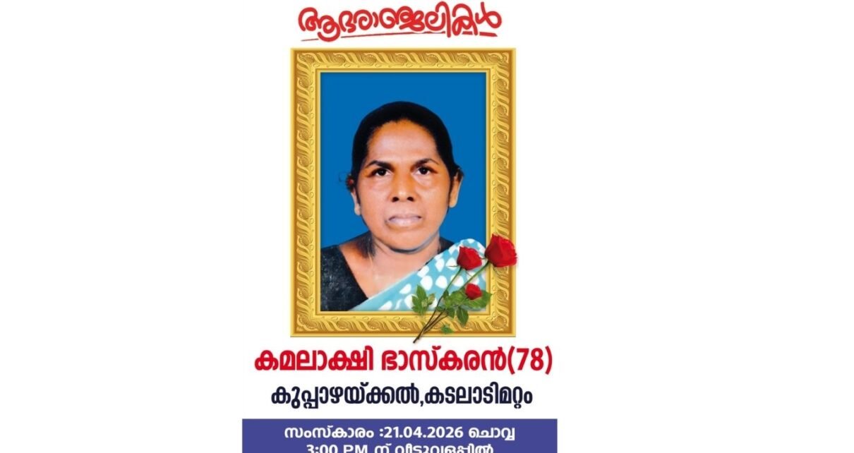 പൂഞ്ഞാർ: കടലാടിമറ്റം കുപ്പാഴയ്ക്കൽ പരേതനായ ഭാസ്കരന്റെ ഭാര്യാ കമലാക്ഷി ഭാസ്കരൻ (78) നിര്യാതയായി. സംസ്കാരം ഇന്ന് (21-04-2026 ചൊവ്വ) ഉച്ചകഴിഞ്ഞ് 3.00 ന് വീട്ടുവളപ്പിൽ. പരേത ചിറക്കടവ് കുഴിമറ്റത്ത് കുടുംബാംഗം.