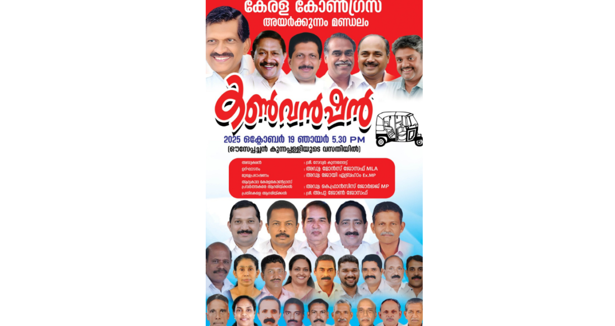 അയർക്കുന്നം :കേരള കോൺഗ്രസ് മണ്ഡലം കൺവെൻഷനും പ്രതിഭാ സംഗമവും ഞായറാഴ്ച വൈകുന്നേരം 5.30 ന് ഔസേപ്പച്ചൻ കുന്നപ്പള്ളിയുടെ ഭവനാങ്കണത്തിൽ വെച്ച് നടത്തപ്പെടുന്നു. മണ്ഡലം പ്രസിഡന്റ് സേവ്യർ കുന്നത്തേട്ടിന്റെ അധ്യക്ഷതയിൽ എക്സിക്യൂട്ടീവ് ചെയർമാൻ അഡ്വ.മോൻസ് ജോസഫ് എംഎൽഎ ഉദ്ഘാടനം ചെയ്യും.