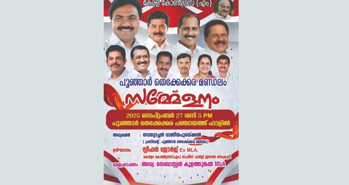 കേരള കോൺഗ്രസ് എം പൂഞ്ഞാർ തെക്കേക്കര മണ്ഡലം സമ്മേളനം പൂഞ്ഞാർ തെക്കേക്കര പഞ്ചായത്ത് ഹാളിൽ നാളെ (27/09/2025) നടക്കുന്നു. പൂഞ്ഞാർ തെക്കേക്കര മണ്ഡലം കമ്മിറ്റിയുടെ പുതിയ ഓഫീസ് ഉദ്ഘാടനവും പ്രകടനവും ഇതോടൊപ്പം ഉണ്ടായിരിക്കുന്നതാണ്.
