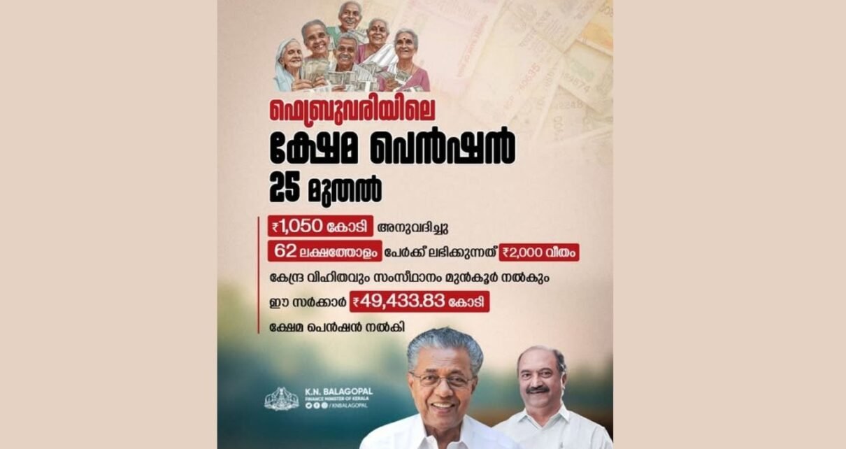 ഫെബ്രുവരിയിലെ സാമൂഹ്യ സുരക്ഷ, ക്ഷേമനിധി പെന്‍ഷനുകള്‍ 25 മുതല്‍ വിതരണം ചെയ്യും ;1,050 കോടി രൂപ അനുവദിച്ചു