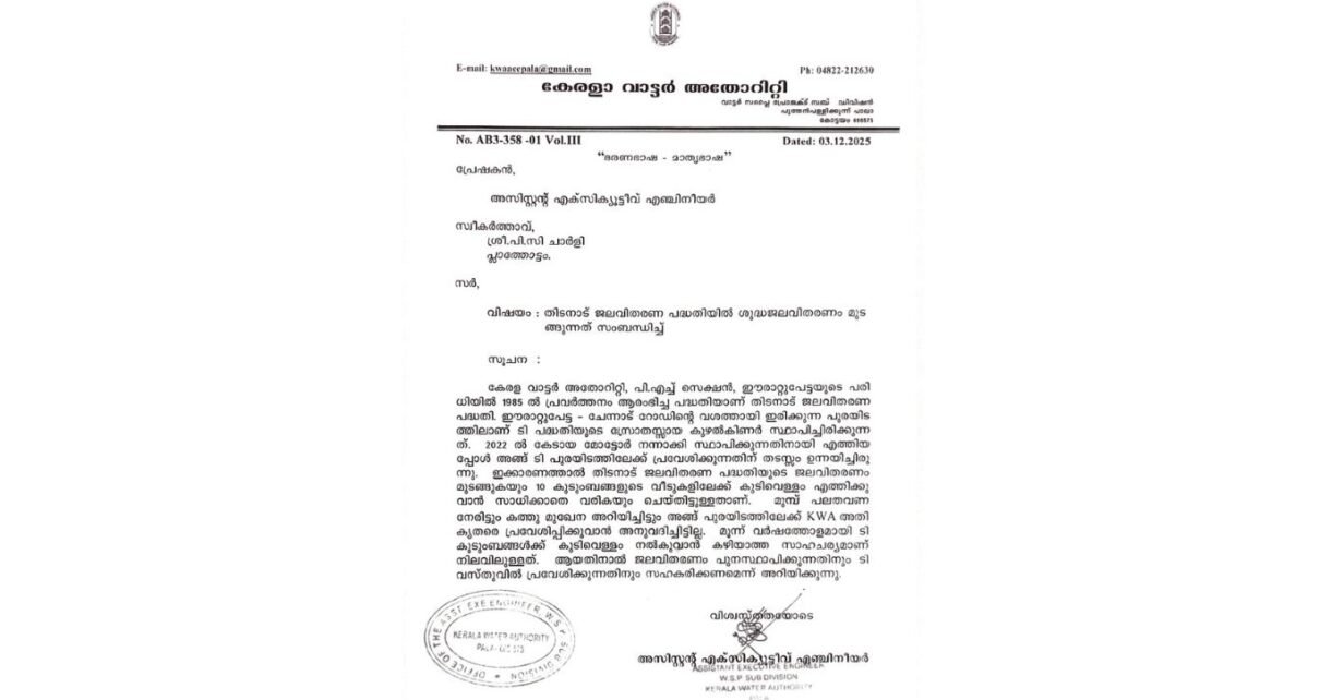 ഈരാറ്റുപേട്ട : കേരള വാട്ടർ അതോറിറ്റിയുടെ കീഴിലുള്ള തിടനാട് ജല വിതരണ പദ്ധതിയുടെ ജലസ്രോതസ്സ് ആയിരുന്ന കുഴൽ കിണറും അതിനോടനുബന്ധിച്ചുള്ള മോട്ടോറും, പമ്പ് ഹൗസും അനധികൃതമായി കയ്യടക്കി വെച്ചിരിക്കുന്നത് വിട്ടു നൽകണമെന്നും മോട്ടോർ നന്നാക്കാനും മറ്റും വസ്തുവിൽ കയറുന്നതിന് അനുവദിക്കണമെന്നും കാണിച്ച് പി.സി ചാർളി, പ്ലാത്തോട്ടം,അരുവിത്തുറ എന്നയാൾക്ക് കേരള വാട്ടർ അതോറിറ്റി അസിസ്റ്റന്റ് എക്സിക്യൂട്ടീവ് എഞ്ചിനീയർ നോട്ടീസ് അയച്ചു.