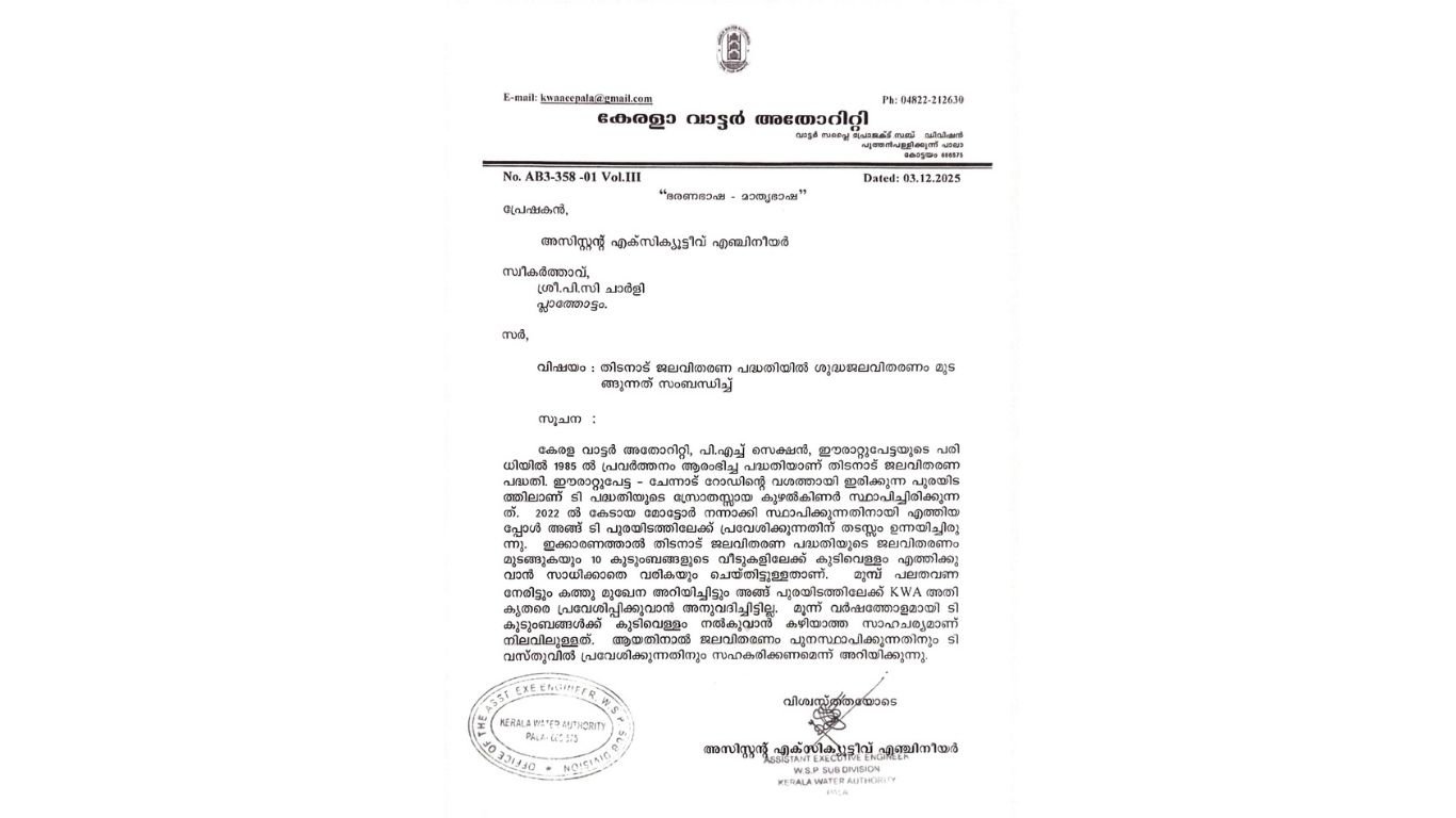 ഈരാറ്റുപേട്ട : കേരള വാട്ടർ അതോറിറ്റിയുടെ കീഴിലുള്ള തിടനാട് ജല വിതരണ പദ്ധതിയുടെ ജലസ്രോതസ്സ് ആയിരുന്ന കുഴൽ കിണറും അതിനോടനുബന്ധിച്ചുള്ള മോട്ടോറും, പമ്പ് ഹൗസും അനധികൃതമായി കയ്യടക്കി വെച്ചിരിക്കുന്നത് വിട്ടു നൽകണമെന്നും മോട്ടോർ നന്നാക്കാനും മറ്റും വസ്തുവിൽ കയറുന്നതിന് അനുവദിക്കണമെന്നും കാണിച്ച് പി.സി ചാർളി, പ്ലാത്തോട്ടം,അരുവിത്തുറ എന്നയാൾക്ക് കേരള വാട്ടർ അതോറിറ്റി അസിസ്റ്റന്റ് എക്സിക്യൂട്ടീവ് എഞ്ചിനീയർ നോട്ടീസ് അയച്ചു.