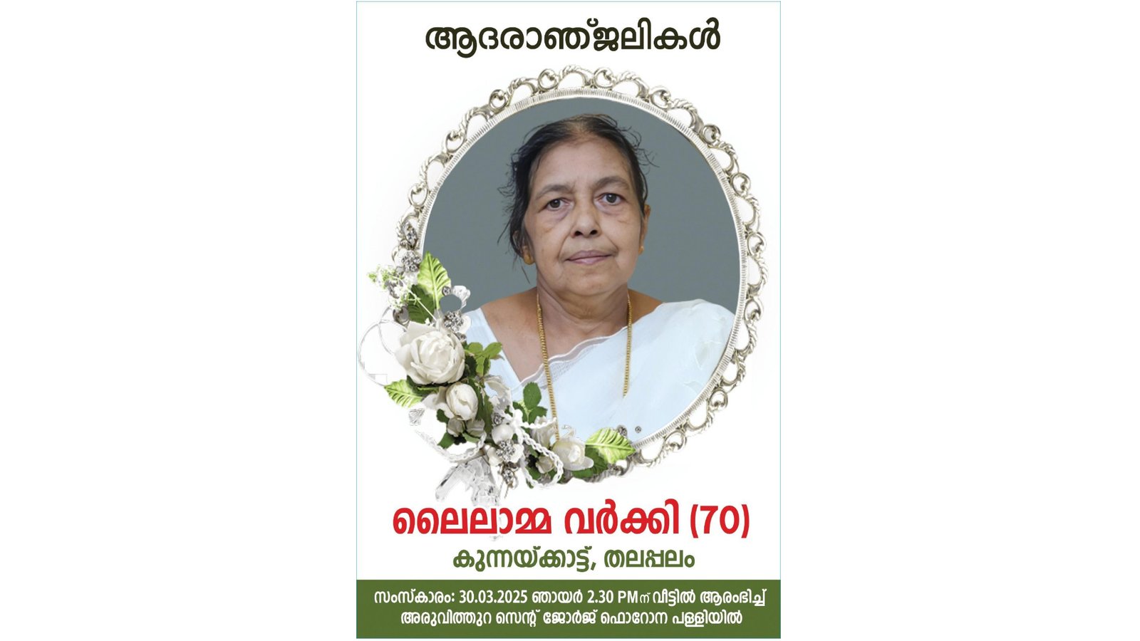 മൃതസംസ്കാര ശുശ്രഷകൾ നാളെ (30.03.25 ) ഉച്ചകഴിഞ്ഞ് 2.30ന് സ്വവസതിയിൽ ആരംഭിച്ച് അരുവിത്തുറ സെന്റ് ജോർജ് ഫൊറോനാ പള്ളിയിൽ സംസ്കരിക്കുന്നതാണ്.