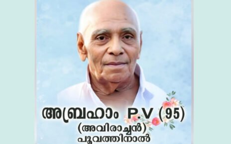 അമ്പാറനിരപ്പേൽ: പൂവത്തിനാൽ അബ്രഹാം പി.വി (അവിരാച്ചൻ–95) അന്തരിച്ചു. സംസ്കാരം ഇന്ന് 2ന് വസതിയിൽ ശുശ്രൂഷയ്ക്കു ശേഷം സെന്റ് ജോൺസ് പള്ളിയിൽ. ഭാര്യ: പ്ലാശനാൽ കാരുപറമ്പിൽ പരേതയായ റോസമ്മ. മക്കൾ: ഷേർളി, ഷീല, ഷാന്റി, ഷൈനി, കുര്യച്ചൻ, സിബിച്ചൻ, പരേതരായ ഷാജി, സണ്ണിച്ചൻ. മരുമക്കൾ: പരേതനായ തോമസ് പുരയിടത്തിൽ (ഇടമറുക്), പ്രഫ. പി.ജെ.തോമസ് പുത്തൻപുരയിൽ (തൃശൂർ), വർക്കിച്ചൻ വലിയവീട്ടിൽ (കുറ്റിയാനിക്കൽ), സാജൻ തോട്ടുങ്കൽ (പാലാ), സ്മിത കവലയ്ക്കൽ (ചമ്പക്കുളം), സ്നേഹ ഉഴുന്നാലിൽ (രാമപുരം), റിനാ മണിയങ്ങാട്ട് (കോതമംഗലം).