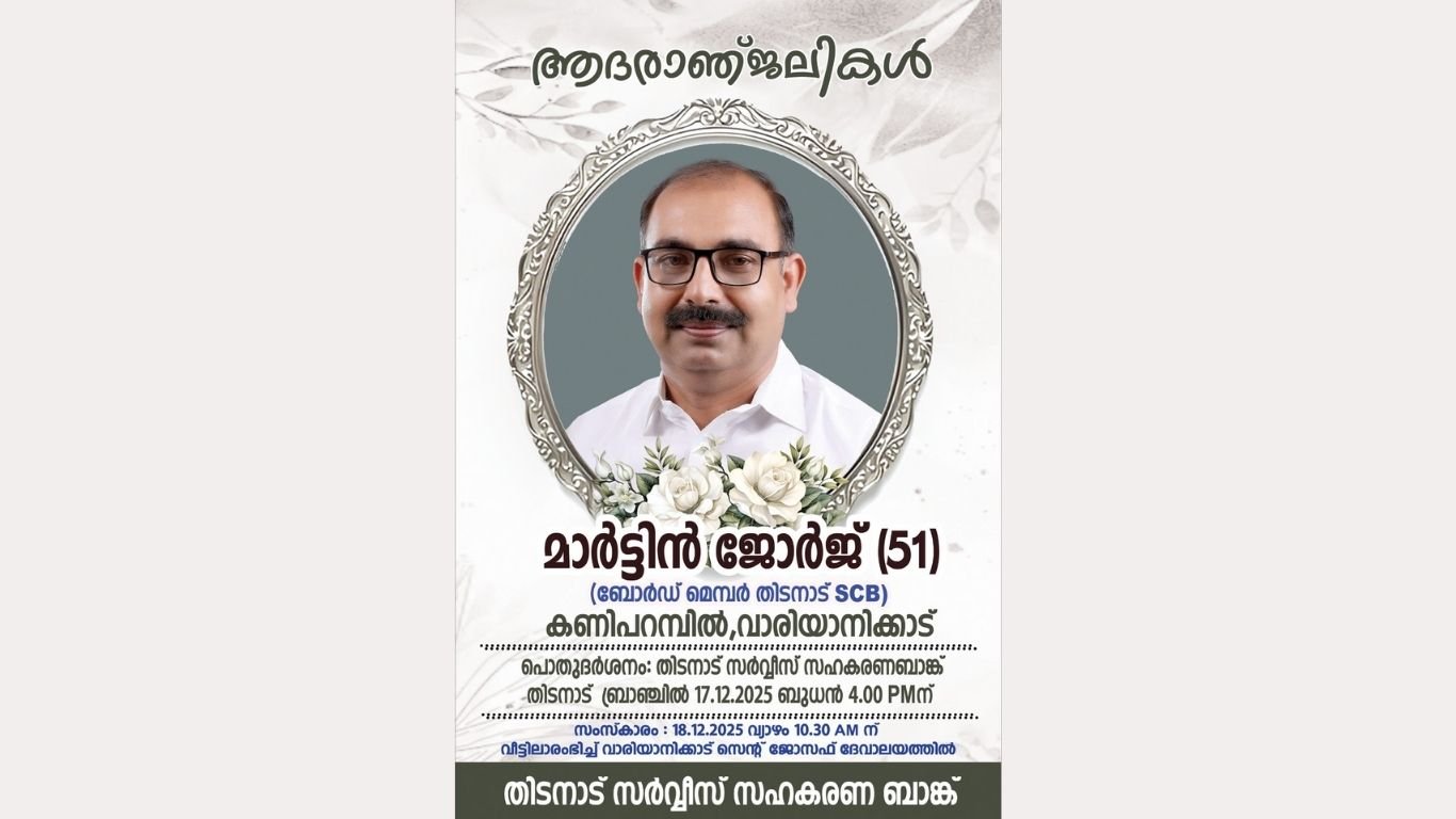 വാരിയാനിക്കാട്: കണിപറമ്പിൽ കെ.വി.ജോർജിന്റെയും അച്ചാമ്മയുടെയും മകൻ തിടനാട് സർവീസ് സഹകരണബാങ്ക് ഭരണസമിതിയംഗം മാർട്ടിൻ ജോർജ് (51) അന്തരിച്ചു.