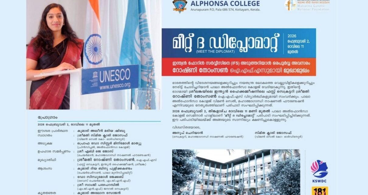 പാലാ: ഇന്ത്യൻ ഫോറിൻ സർവ്വീസിനെ അടുത്തറിയുക എന്ന ലക്ഷ്യത്തോടെ ഫെബ്രുവരി 2 ന് മഹാത്മാഗാന്ധി നാഷണൽ ഫൗണ്ടേഷനും അൽഫോൻസാ കോളജ് വിമൺ സെല്ലും ചേർന്ന് അൽഫോൻസാ കോളജിൽ ‘മീറ്റ് ദ ഡിപ്ലോമാറ്റ്’ പരിപാടി സംഘടിപ്പിക്കുന്നു.