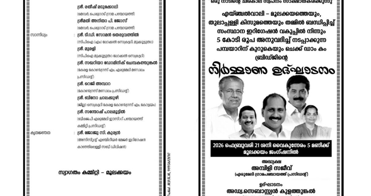 എരുമേലി ഗ്രാമപഞ്ചായത്ത് പത്താം വാർഡിലെ മൂലക്കയത്തെയും, പെരുനാട് ഗ്രാമപഞ്ചായത്ത് എട്ടാം വാർഡ് കിസുമത്തെയും തമ്മിൽ ബന്ധിപ്പിച്ച് സംസ്ഥാന ഇറിഗേഷൻ വകുപ്പിൽ നിന്നും 5 കോടി രൂപ വിനിയോഗിച്ച് പമ്പയാറിന് കുറുകെ നിർമിക്കുന്ന ചെക്ക് ഡാം കം ബ്രിഡ്ജിന്റെ നിർമ്മാണ ഉദ്ഘാടനം 21-)o തിയതി വൈകിട്ട് 5 മണിക്ക് മൂലക്കയം ജംഗ്ഷനിൽ അഡ്വ. സെബാസ്റ്റ്യൻ കുളത്തുങ്കൽ എംഎൽഎ നിർവഹിക്കും.