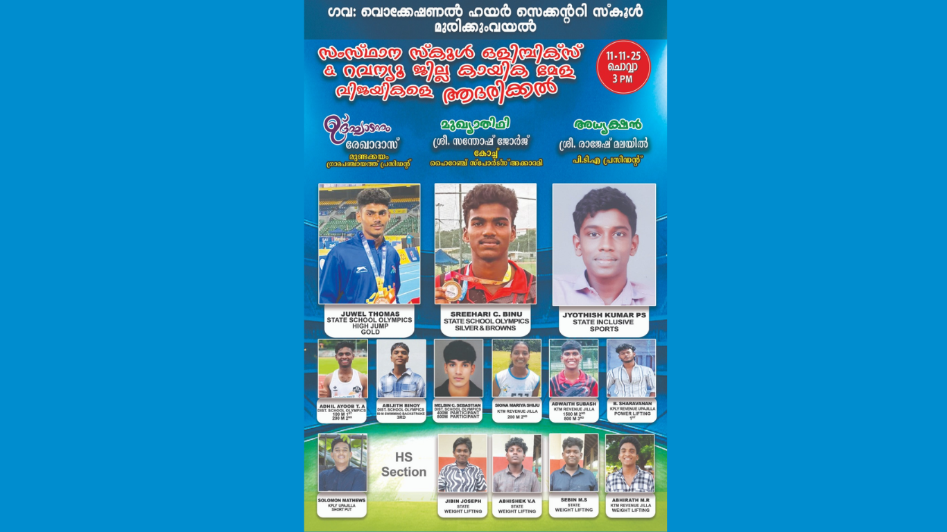 സംസ്ഥാന സ്കൂൾ ഒളിമ്പിക്സ് ഹൈജമ്പിൽ ഗോൾഡ് മെഡലും , നൂറ് മീറ്റർ, ഇരുനൂറ് മീറ്റർ റിലേയിലും വെള്ളി മെഡൽ നേടി കേരള ഒളിമ്പിക്സിൽ കായികമേളയിൽ മികച്ച പ്രകടനം കാഴ്ചവെച്ച് ദേശീയ കായികമേളയിൽ പങ്കെടുക്കാൻ അർഹത നേടിയ മുരിക്കുംവയൽ ഗവൺമെന്റ് വൊക്കേഷണൽ ഹയർ സെക്കൻഡറി സ്കൂളിലെ വിഎച്ച്എസ്ഇ രണ്ടാം വർഷ വിദ്യാർത്ഥിയായ ജുവൽ തോമസിനെയും ഒന്നാം വർഷ വിദ്യാർത്ഥിയായ ശ്രീഹരി സി ബിനുവിനെയും, കോട്ടയം റവന്യൂ ജില്ലാ കായിക മേള വിജയികളെയും ഹൈറേഞ്ചസ്പോർട്സ് അക്കാദമി കോച്ച് സന്തോഷ് ജോർജിനെയു നവംബർ 11 ന് ഉച്ചക്കഴിഞ്ഞ് 3 മണിയ്ക്ക് സ്കൂൾ ഓഡിറ്റോറിയത്തിൽ വച്ച് പി ടി എയുടെ ആഭിമുഖ്യത്തിൽ ആദരിക്കുന്നു.