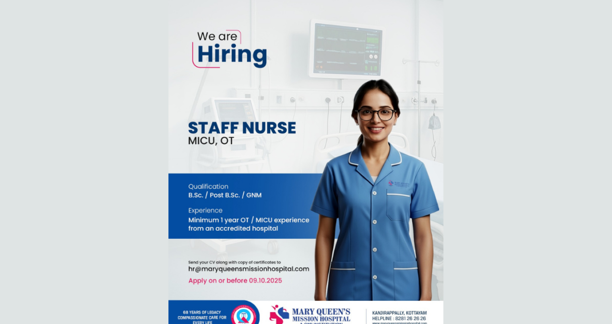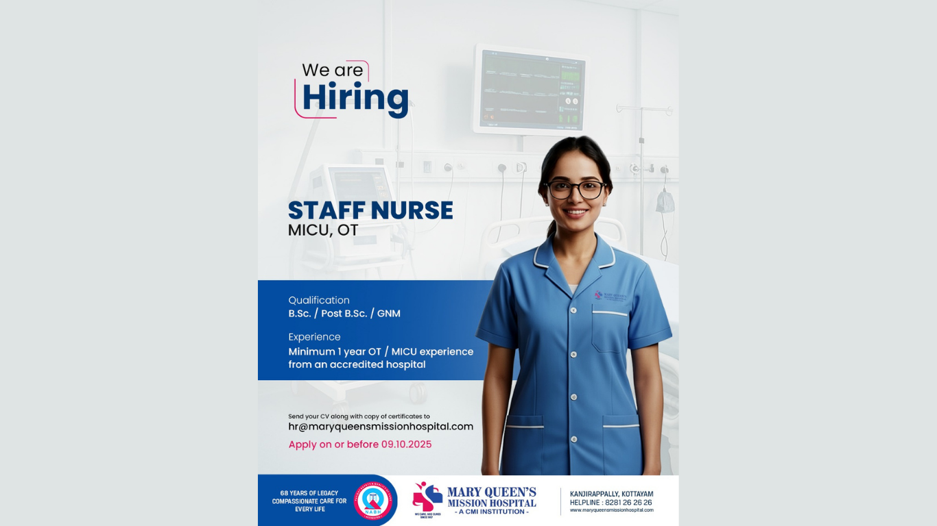 വിശദമായ സി.വി 2025 ഒക്ടോബർ 09 നു മുൻപായി hr@maryqueensmissionhospital.com എന്ന ഈമെയിൽ വിലാസത്തിൽ അയക്കേണ്ടതാണ്.