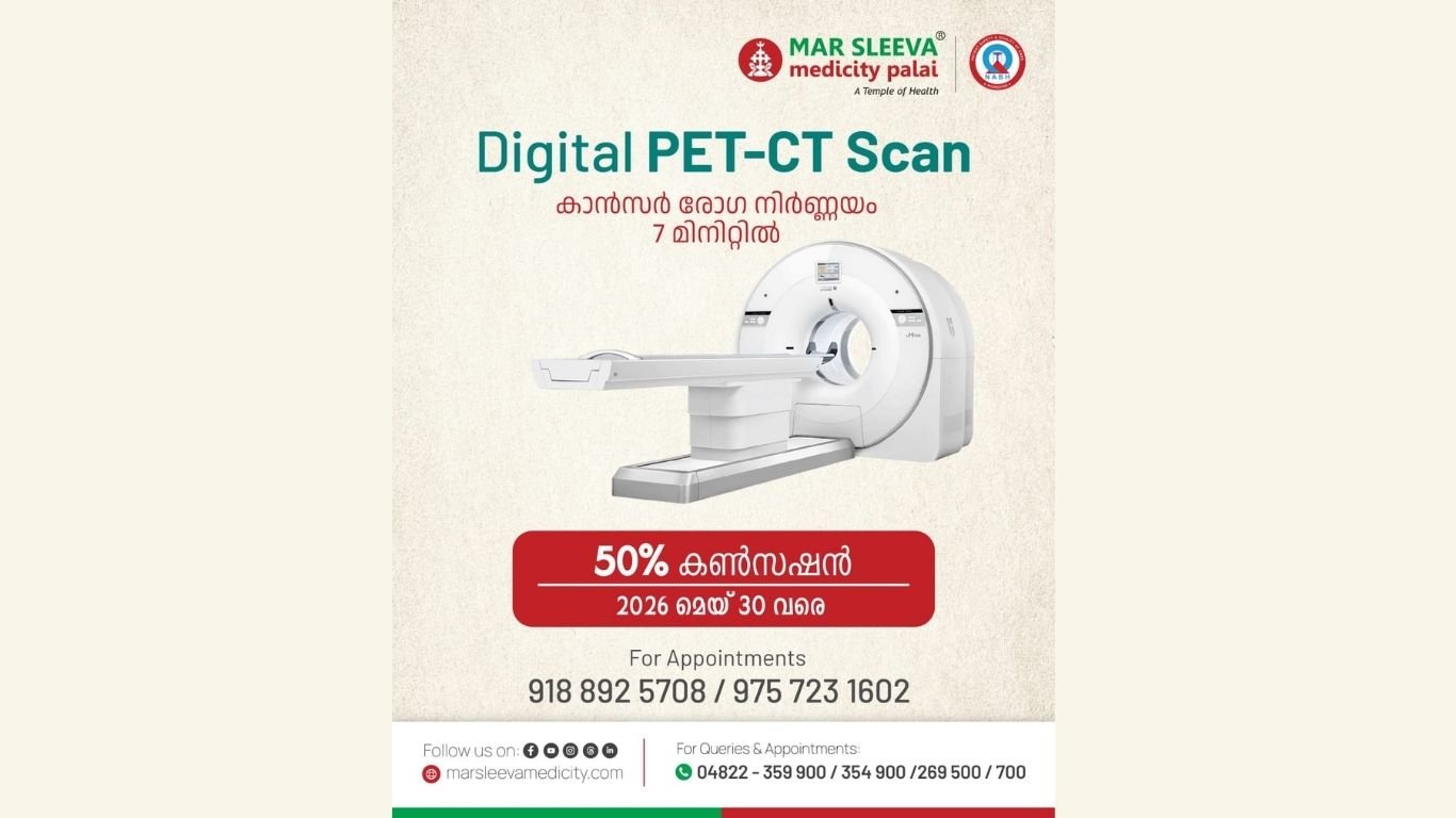 പാലാ: മാർ സ്ലീവാ മെഡിസിറ്റിയിൽ കാൻസർ രോ​ഗനിർണയത്തിനുള്ള പെറ്റ് സ്കാൻ 50 % കുറവ് നിരക്കിൽ ചെയ്യാൻ അവസരം. 2026 മെയ് 30 വരെയാണ് കുറവ് നിരക്ക് ലഭ്യമാകുക.