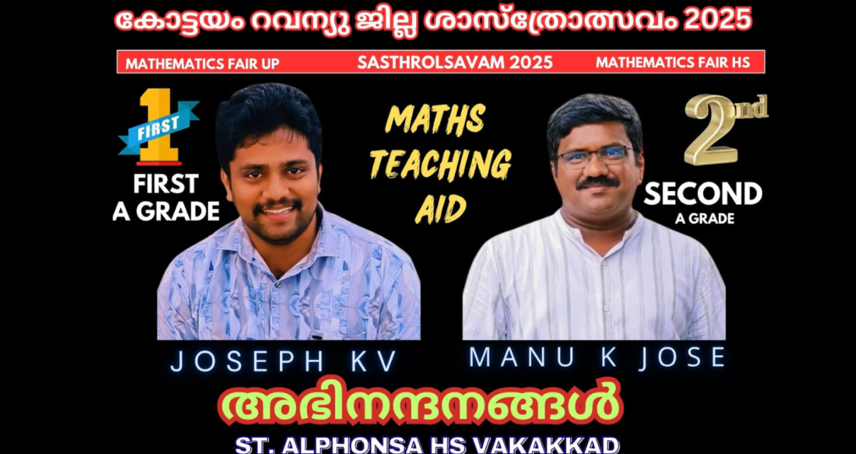 യുപി വിഭാഗം ഗണിതശാസ്ത്രം ടീച്ചിങ് എയ്ഡ് മത്സരത്തിൽ എ ഗ്രേഡോടെ ഒന്നാം സ്ഥാനം നേടിയ ജോസഫ് കെ വി കുളത്തിനാൽ, ഹൈസ്കൂൾ വിഭാഗം ടീച്ചിങ് എയ്ഡ് മത്സരത്തിൽ എ ഗ്രേഡോടെ രണ്ടാം സ്ഥാനം നേടിയ മനു കെ ജോസ് കൂനാനിക്കൽ എന്നീ അധ്യാപകരാണ് പാലക്കാട് വച്ച് നടക്കുന്ന സംസ്ഥാന ശാസ്ത്രോത്സവത്തിൽ കോട്ടയം ജില്ലയെ പ്രതിനിധീകരിക്കുന്നതിന് വാകക്കാട് സെൻ്റ് അൽഫോൻസ ഹൈസ്കൂളിൽ നിന്നും യോഗ്യത നേടിയിരിക്കുന്നത്.