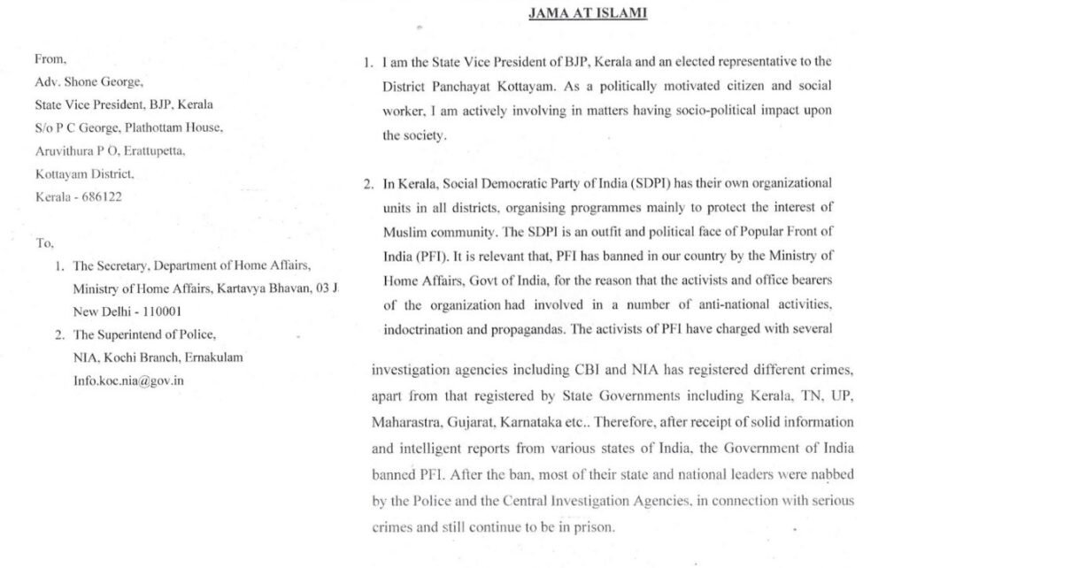കോട്ടയം: ഭീകരവാദ പ്രവർത്തനം കണ്ടെത്തി പോപ്പുലർ ഫ്രണ്ടിനെ നിരോധിച്ച എങ്കിലും രാഷ്ട്രീയ പാർട്ടിയായ എസ്ഡിപിഐയുടെയും ജമാഅത്തെ ഇസ്ലാമിയുടെയും മറവിൽ ഗുരുതരമായ തീവ്രവാദ ഇടപെടലുകൾ കേരളത്തിൽ നടക്കുന്നുണ്ട് എന്ന് ചൂണ്ടിക്കാട്ടിയാണ് പരാതി.