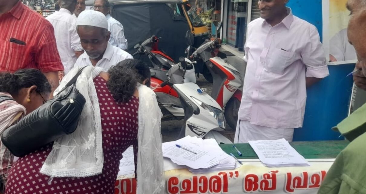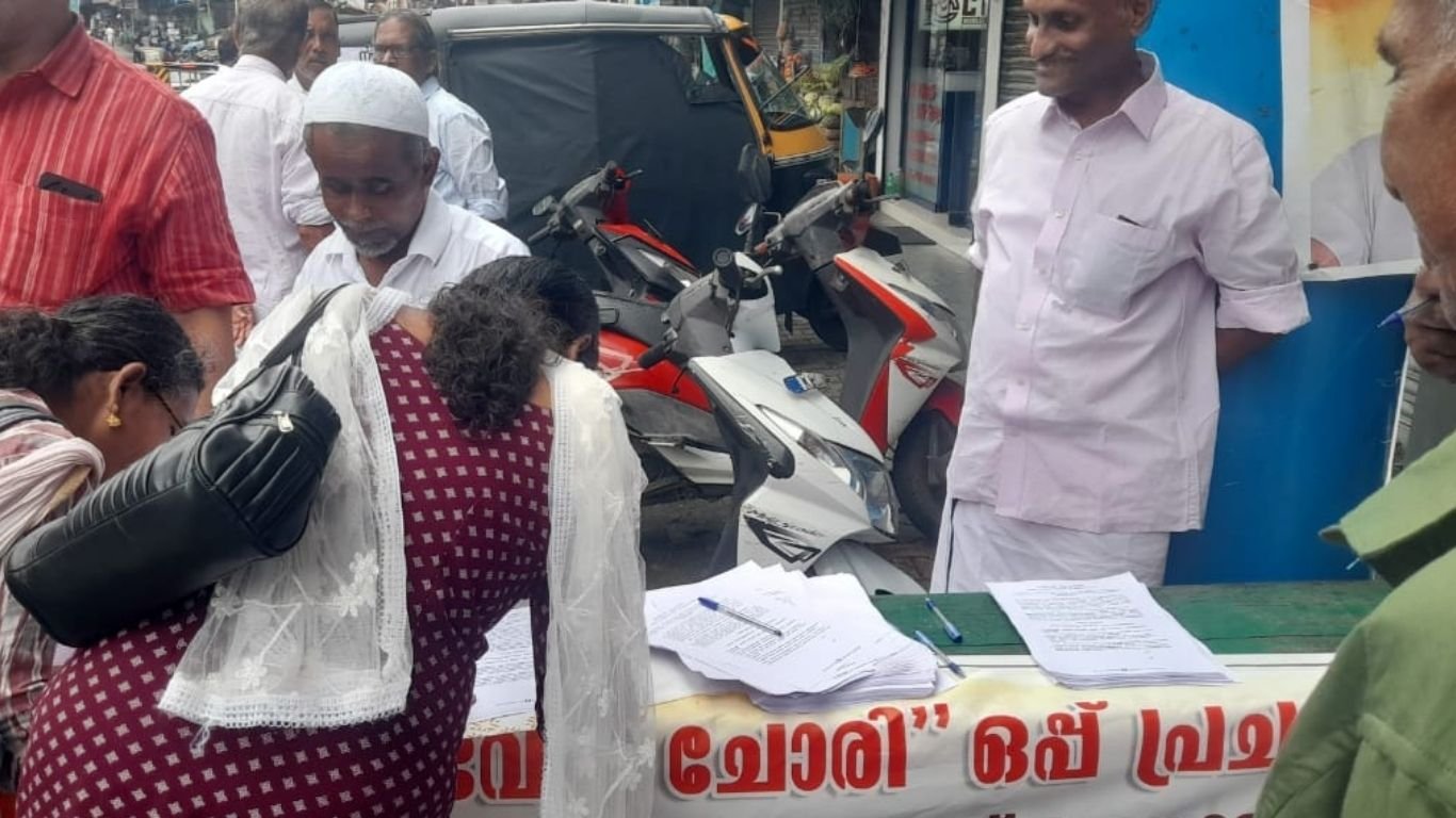 ഈരാറ്റുപേട്ട : ജനാധിപത്യ രാജ്യത്ത് ഒരോ പൗരന്റെയുംഅവകാശമായ വോട്ട് അവകാശങ്ങളെ കൃത്രിമം നടത്തുകയും ചെയ്യുന്നവരെ കണ്ടില്ല എന്ന് നടിക്കുന്ന തിഞ്ഞെടുപ്പ് കമ്മീഷന്റെ നടപടിക്കെതിരെ അഞ്ച് കോടി ഒപ്പുകൾ ശേഖരിച്ച് രാഷ്ട്രപതിക്ക് നൽകാൻ അഖിലേന്ത്യ കോൺഗ്രസ് കമ്മറ്റിയുടെ നിർദേശപ്രകാരം മണ്ഡലം കോൺഗ്രസ് കമ്മറ്റിയുടെ ഒപ്പുശേഖരണ പരിപാടിക്ക് ഇന്ന് നൈനാർ മസ്ജിദ് മുന്നിൽ തുടക്കം കുറിച്ചു.