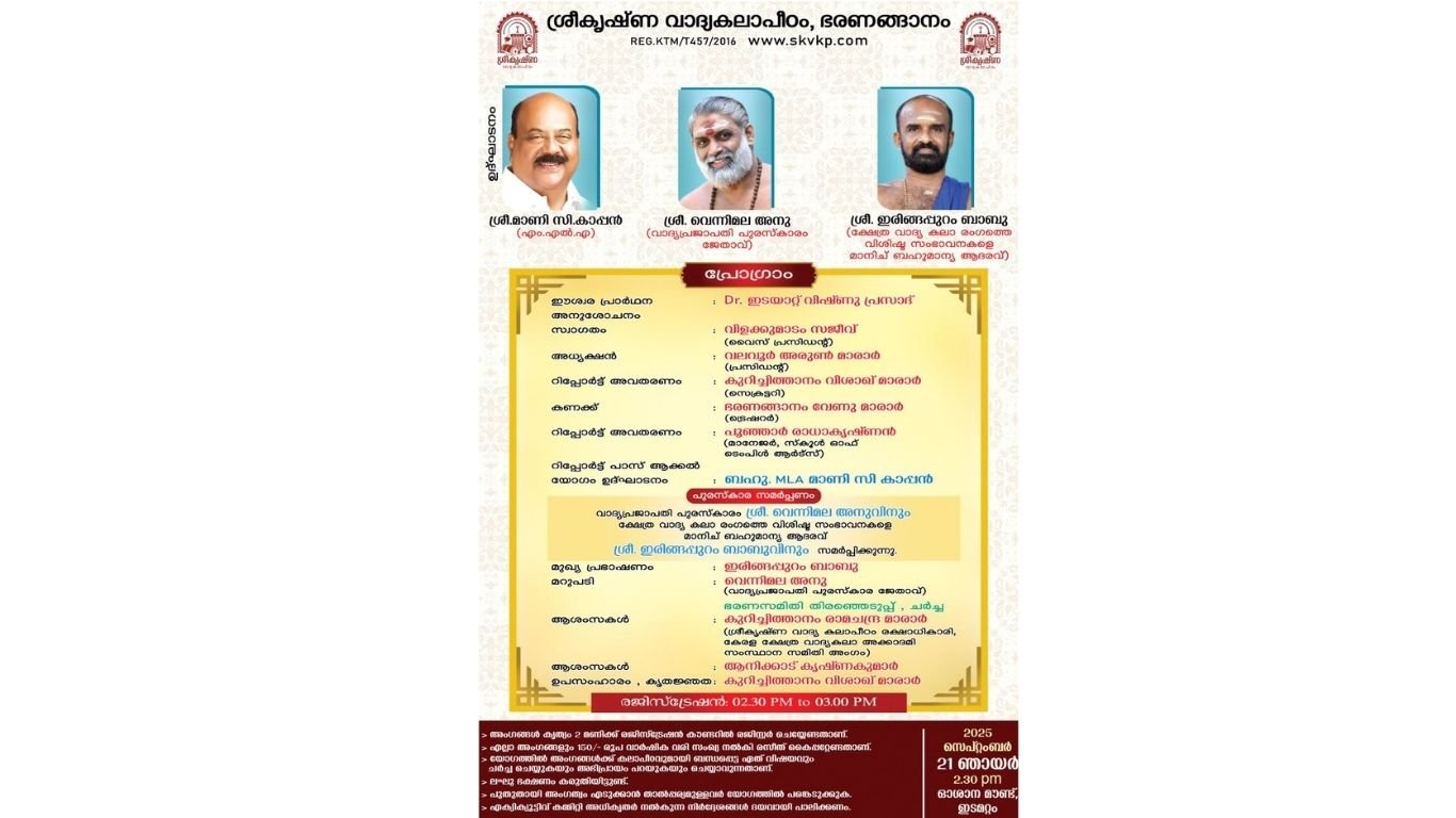 ഭരണങ്ങാനം : ക്ഷേത്ര വാദ്യ കലാകാരന്മാരുടെ സംഘടനയായ ശ്രീകൃഷ്ണ വാദ്യ കലാപീഠത്തിന്റെ 9 ആം വാർഷിക പൊതുയോഗവും , പുരസ്കാര വിതരണവും 21 – 09 – 2025 ഞായറാഴ്ച ഉച്ചകഴിഞ്ഞു 2.30 ന് ഇടമറ്റം ഓശാന മൗണ്ടിൽ വച് നടക്കും.