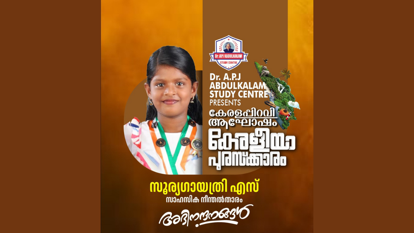 കേരളപ്പിറവി ആഘോഷങ്ങളുടെ ഭാഗമായി ഡോക്ടർ എ പി ജെ അബ്‌ദുൾകലാം സ്റ്റഡിസെന്റർ സമസ്ത മേഖലകളിൽ മികവ് തെളിയിച്ചവർക്കായി ഏർപ്പെടുത്തിയ കേരളീയം പുരസ്കാരത്തിനാണ് സാഹസിക നീന്തൽ താരമായ പത്തുവയസുകാരി കല്ലു എന്ന് വിളിക്കുന്ന സൂര്യഗായത്രി അർഹയായത്.