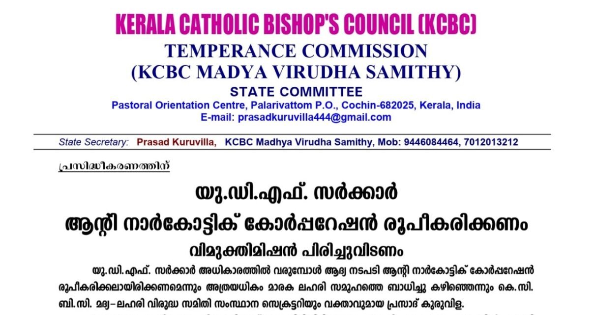 യു.ഡി.എഫ്. സര്‍ക്കാര്‍ അധികാരത്തില്‍ വരുമ്പോള്‍ ആദ്യ നടപടി ആന്റി നാര്‍കോട്ടിക് കോര്‍പ്പറേഷന്‍ രൂപീകരിക്കലായിരിക്കണമെന്നും അത്രയധികം മാരക ലഹരി സമൂഹത്തെ ബാധിച്ചു കഴിഞ്ഞെന്നും കെ.സി.ബി.സി. മദ്യ-ലഹരി വിരുദ്ധ സമിതി സംസ്ഥാന സെക്രട്ടറിയും വക്താവുമായ പ്രസാദ് കുരുവിള.